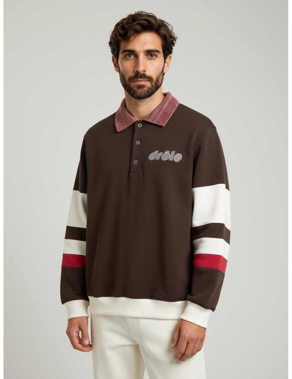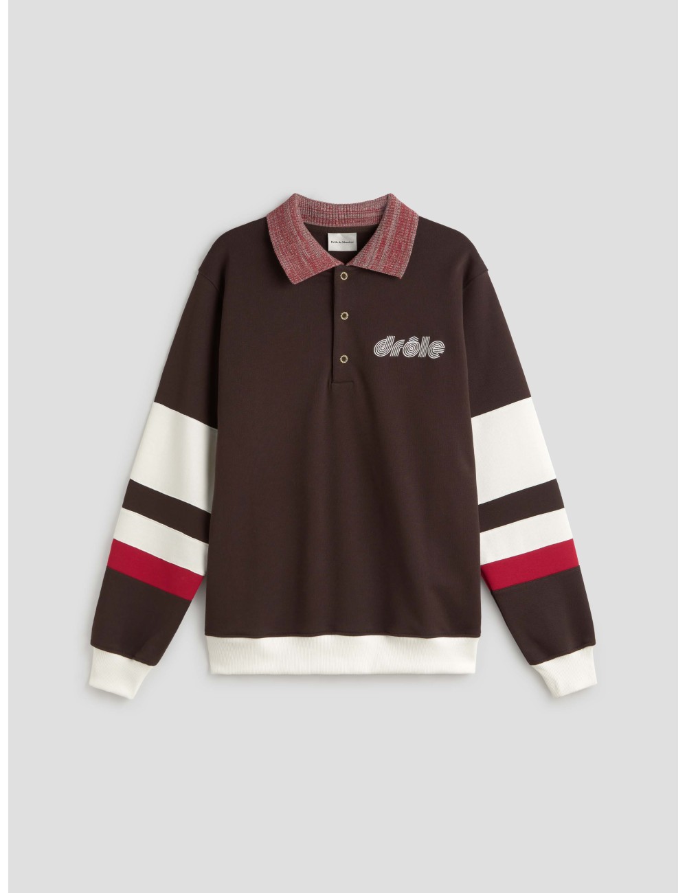 Su confección en algodón 100% garantiza una textura natural, suave al tacto y resistente al uso diario. Los detalles en contraste como las inserciones en las mangas y el cuello de canalé a rayas evocan la herencia deportiva reinterpretada bajo una mirada contemporánea. El bordado “Drôle” en el pecho aporta un sello gráfico sutil, mientras que los tres botones a presión Torsades añaden un acabado moderno y funcional.