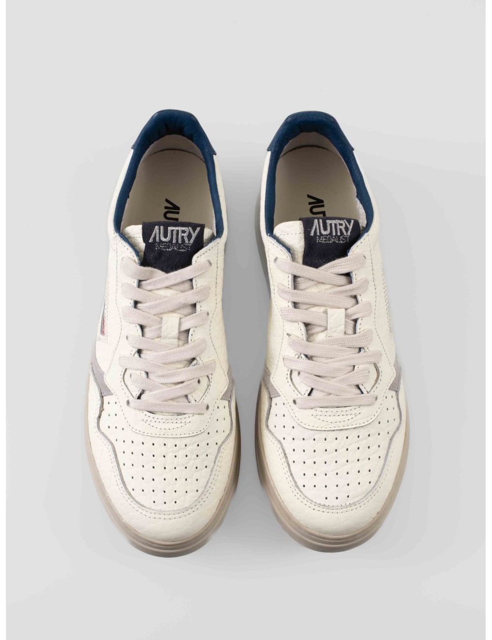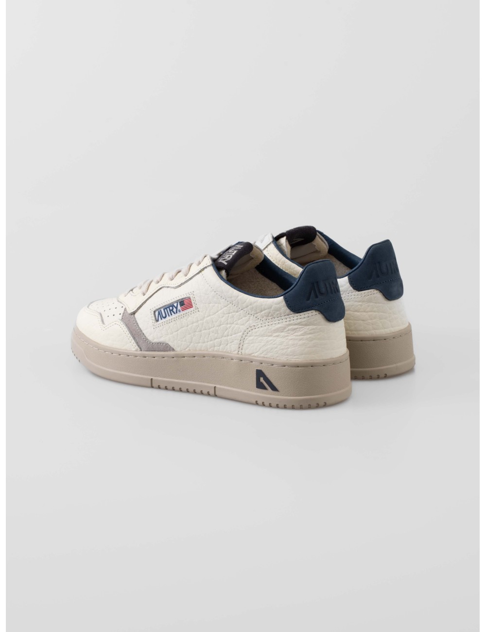 Zapatillas Autry Medalist Low Man en piel texturizada color crudo con detalles en ante gris y talón azul periscope. Inspiración retro-tenis con un diseño robusto, cómodo y versátil para el día a día.