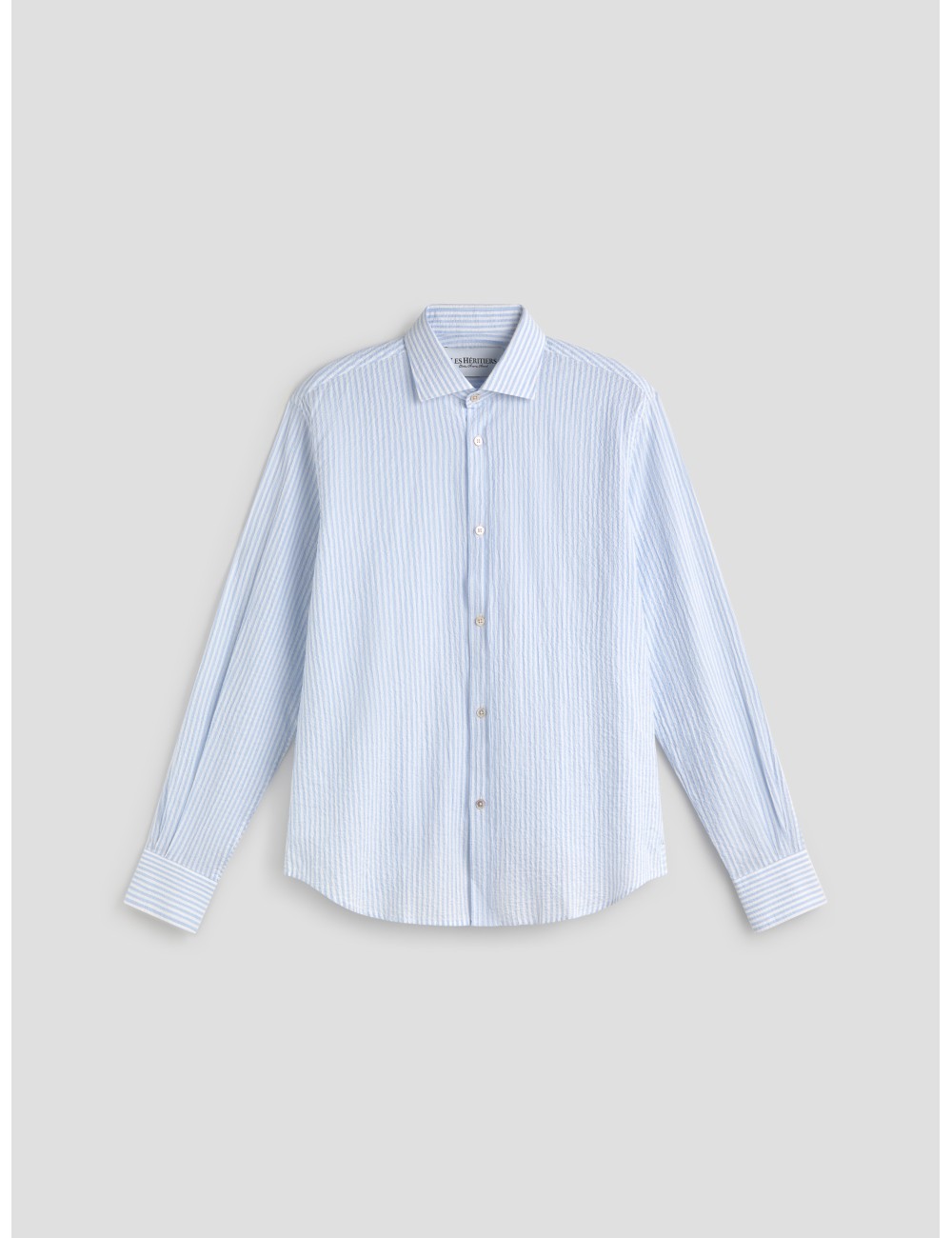 La camisa de manga larga SEERSUCKER SHIRT en color Sky Blue para hombre de Les Héritiers está confeccionada en tejido seersucker 99 % algodón y 1 % spandex, ligero y con estructura arrugada de rayas. Presenta cuello italiano, cierre frontal con botones y puños con botón. Con fit regular y tacto fresco y confortable, está diseñada en Platja d’Aro y fabricada en Barcelona.
