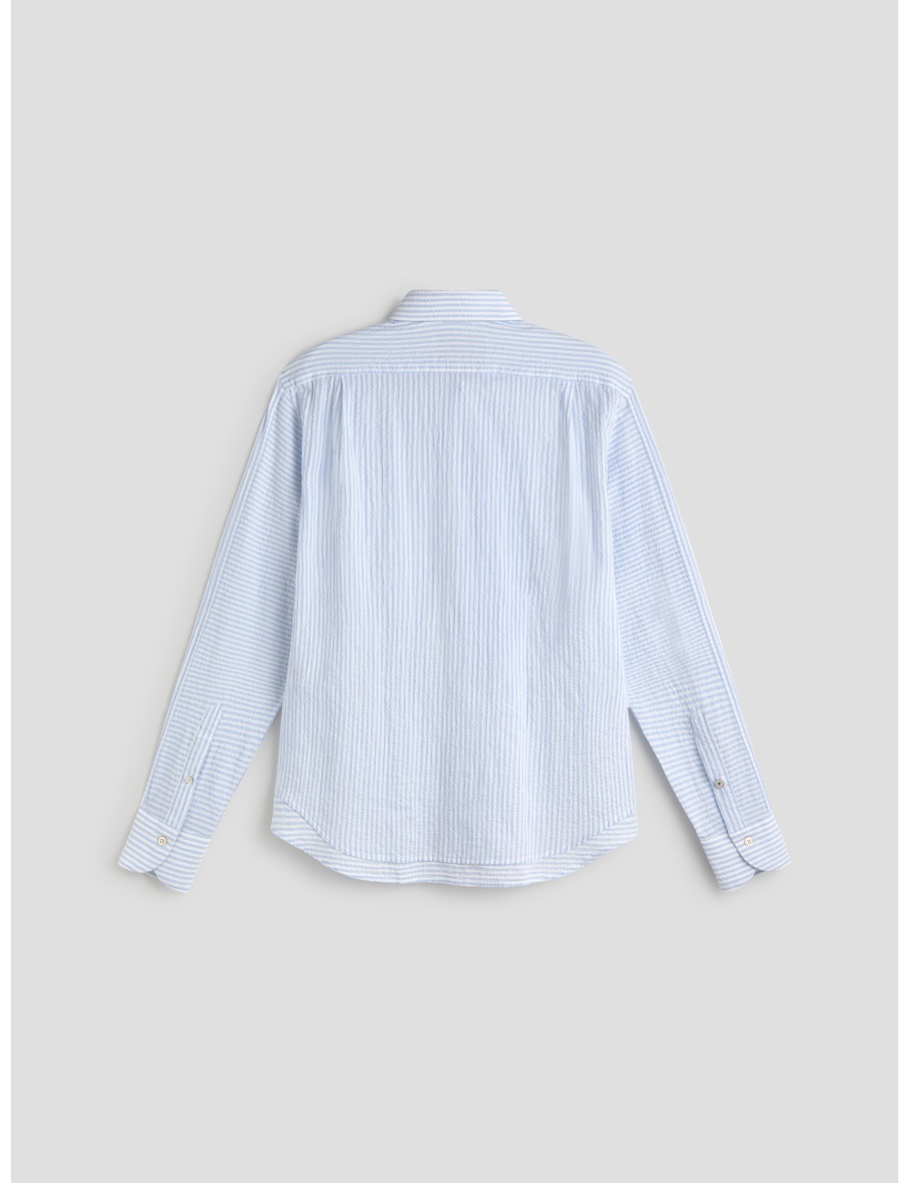 El tono Sky Blue subraya su carácter luminoso y estival, evocando una estética fresca y serena. El tacto fresco y confortable del tejido convierte esta camisa seersucker en una opción adecuada para jornadas largas, donde la ligereza y la estructura marcan la diferencia.