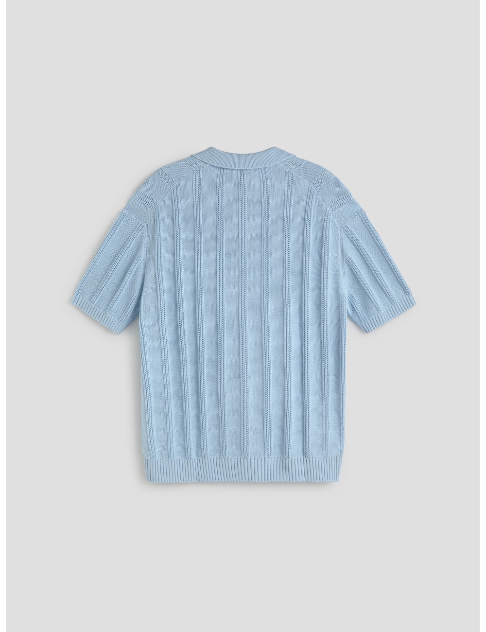 El cuello clásico de polo mantiene la referencia tradicional, mientras que el tono Sky Blue refuerza su carácter fresco y estacional. El color evoca claridad y ligereza, alineándose con la atmósfera de la temporada SS26.