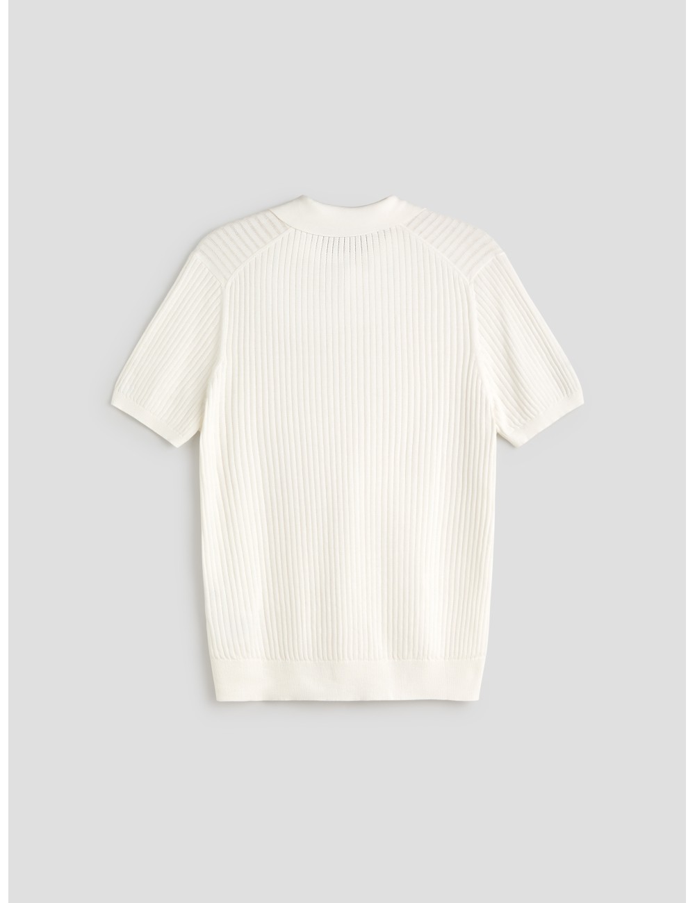 El corte slim fit define la silueta de forma limpia y equilibrada. El cuello polo sin botones refuerza una estética depurada y contemporánea, mientras que los acabados en canalé en mangas y cintura aseguran ajuste y precisión en el acabado.