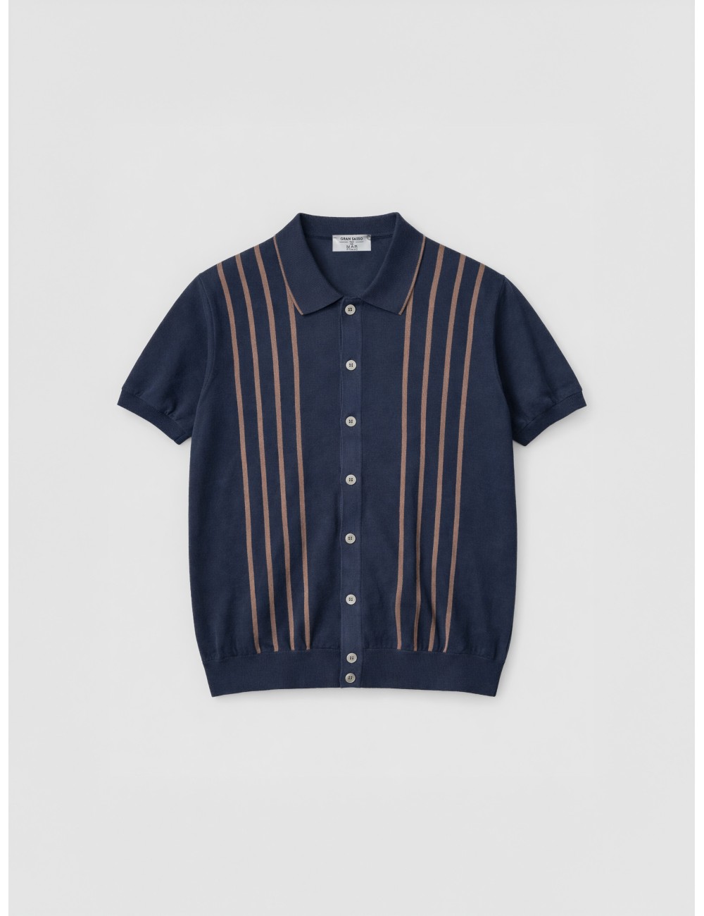 Desarrollada en exclusiva dentro de nuestra colaboración con Gran Sasso, esta camicia de manga corta combina precisión italiana y diseño gráfico depurado. Confeccionada en punto fino de algodón, incorpora botonadura completa y un patrón de rayas verticales que estiliza la silueta con equilibrio contemporáneo.