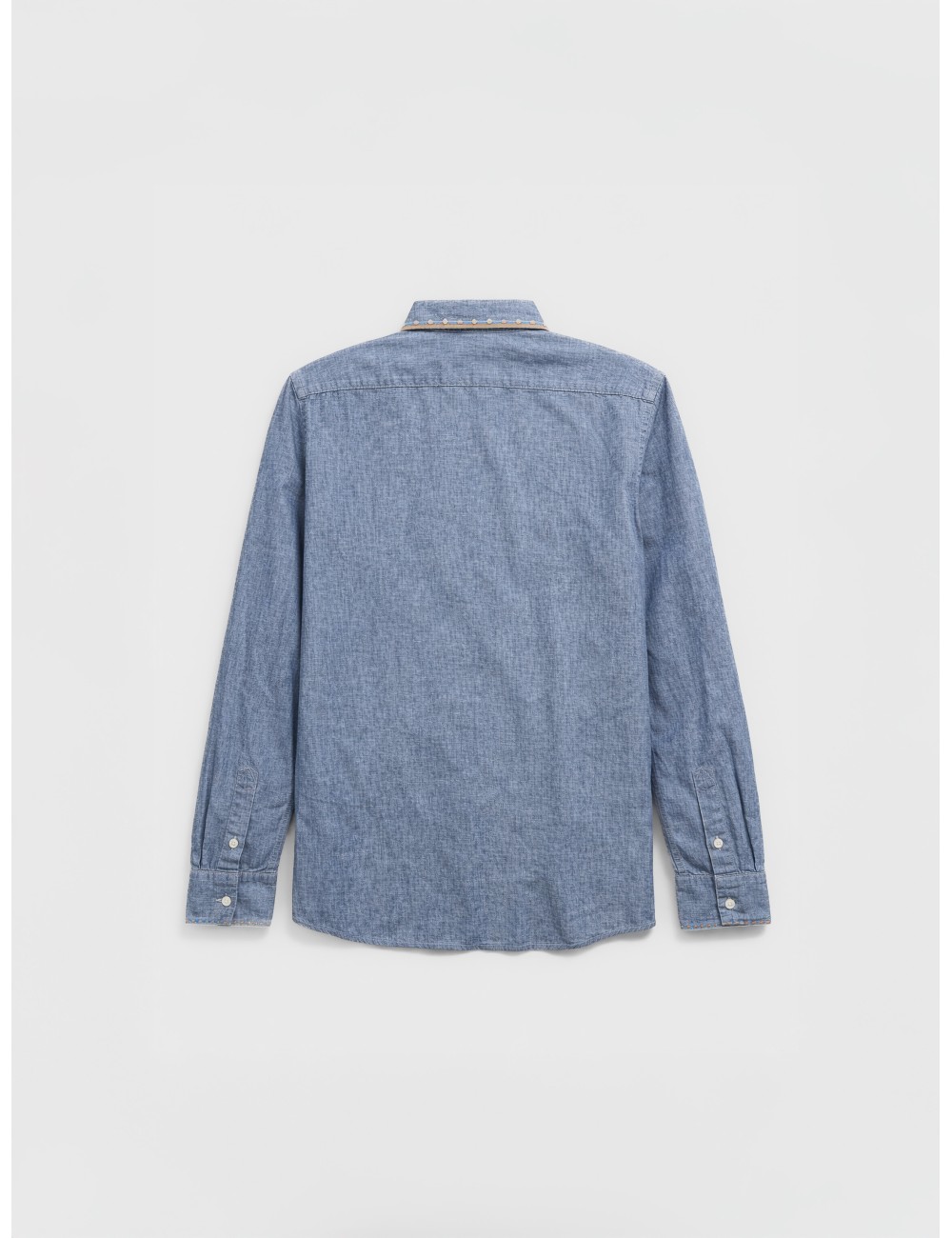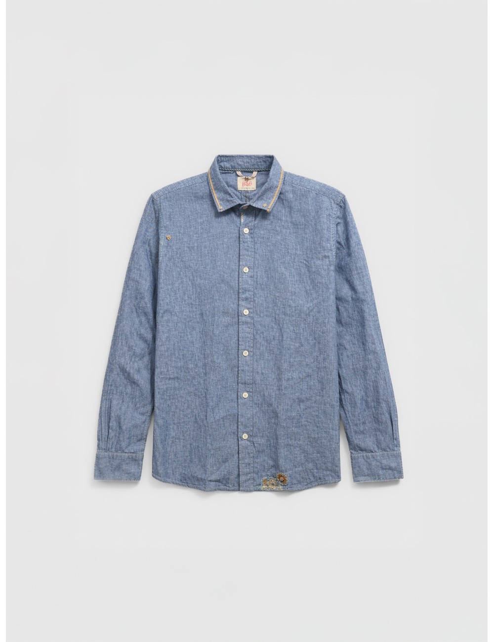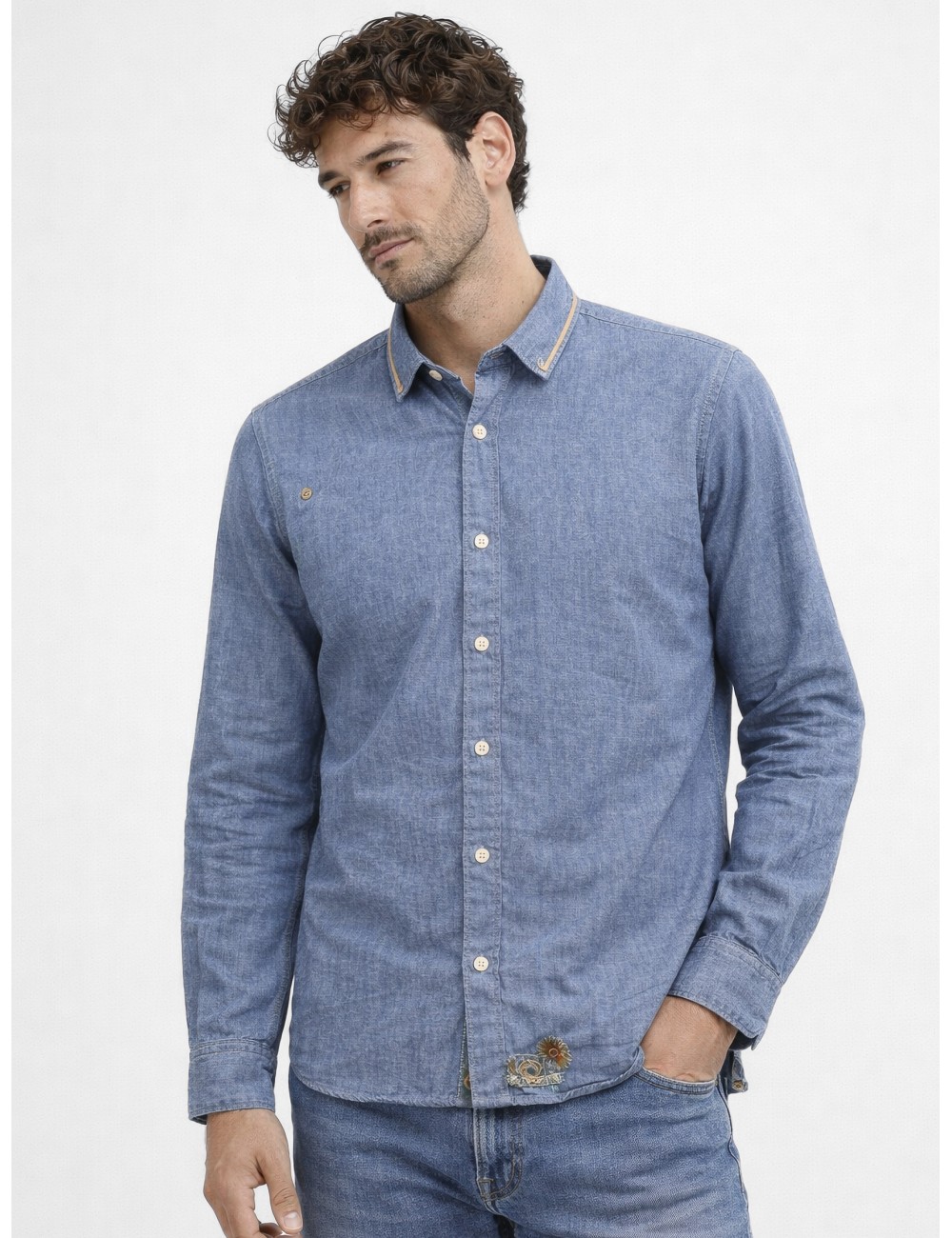 Confeccionada en tejido ligero de aspecto denim, esta camisa de manga larga combina una base clásica con acabados distintivos en el cuello y pequeños bordados decorativos. Una prenda versátil que aporta carácter sin perder funcionalidad.