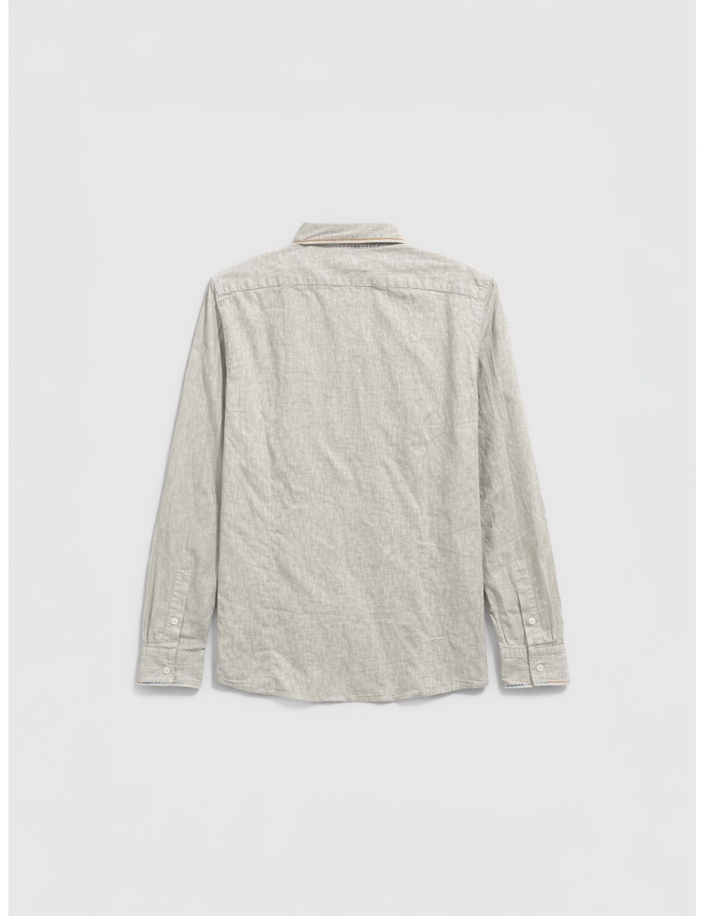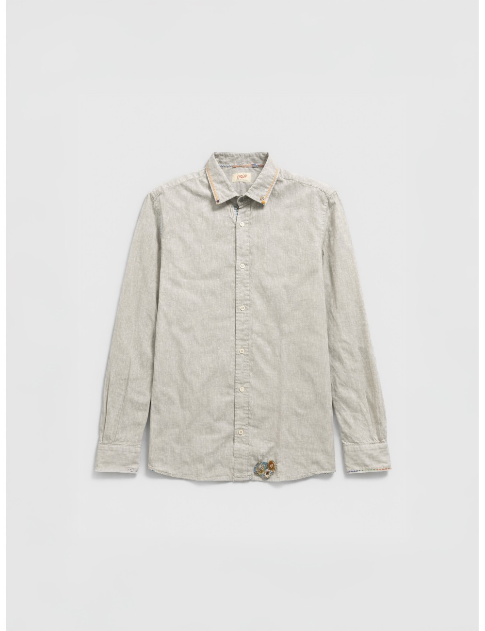 El diseño incorpora cuello clásico con ribete decorativo y pequeños bordados aplicados en el cuello y el frontal, introduciendo un contraste sutil que mantiene el equilibrio visual. El cierre frontal con botones y los puños ajustables conservan la funcionalidad habitual, mientras que el corte regular garantiza una caída cómoda y proporcionada sobre el torso.