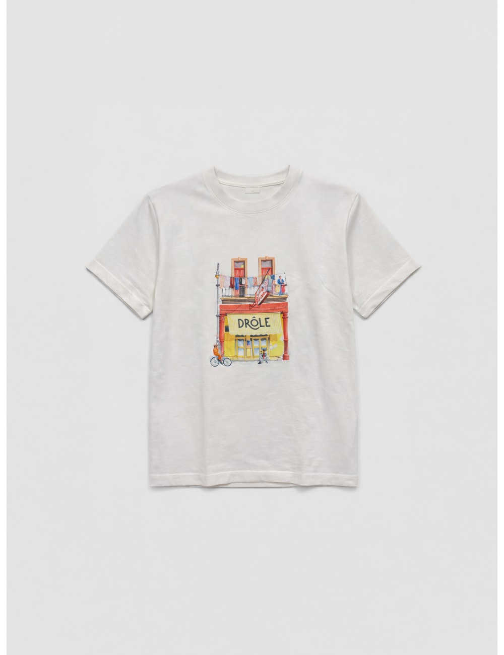 El diseño se centra en la ilustración frontal, que representa una escena urbana con fachada y rótulo Drôle, aportando un enfoque gráfico más narrativo. El contraste sobre la base Off White refuerza la presencia del estampado sin saturar el conjunto. El cuello redondo acanalado mantiene la forma, mientras que el corte regular asegura proporciones cómodas y fáciles de integrar en distintos estilismos.