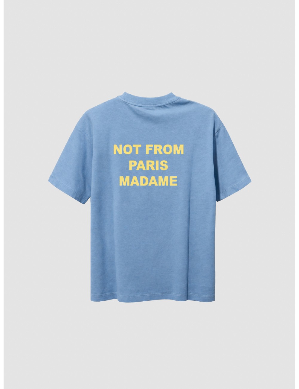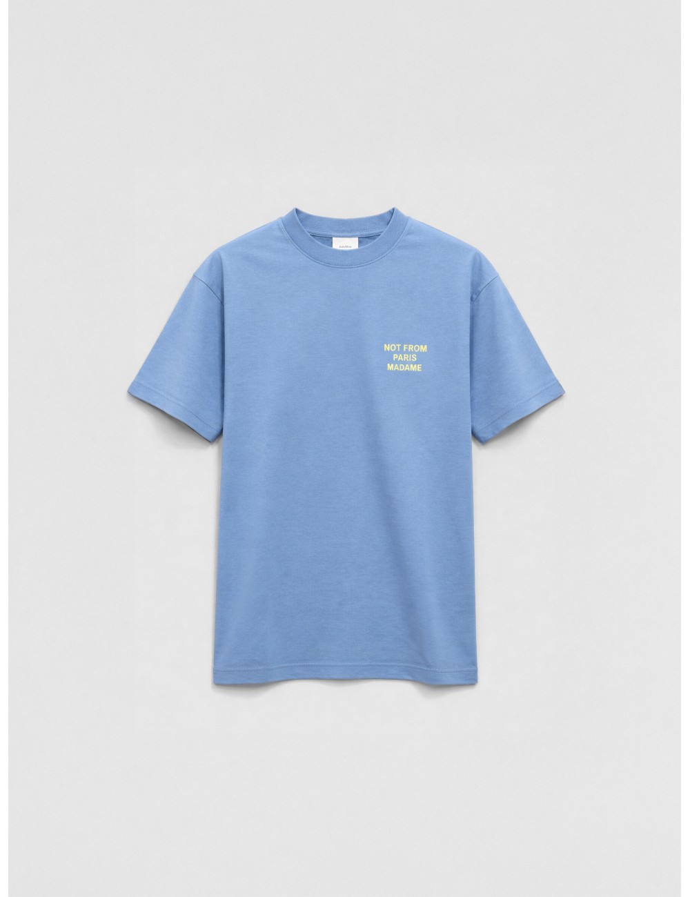 Camiseta Drôle de Monsieur Le T-Shirt Slogan Atlantic Blue para hombre en algodón con estampado icónico. Diseño de manga corta y cuello redondo en tono azul intenso, con el lema “Not From Paris Madame” aplicado en contraste. Una pieza reconocible que combina simplicidad y carácter gráfico.