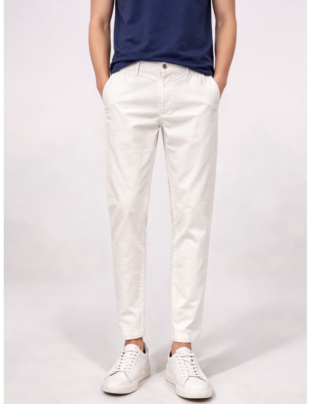 Pantalón Ecoalf Ethiwin Linen White para hombre confeccionado en lino ligero y transpirable. Diseño de corte recto con cierre frontal de botón y cremallera, ideal para estilismos frescos y minimalistas en temporada primavera-verano.