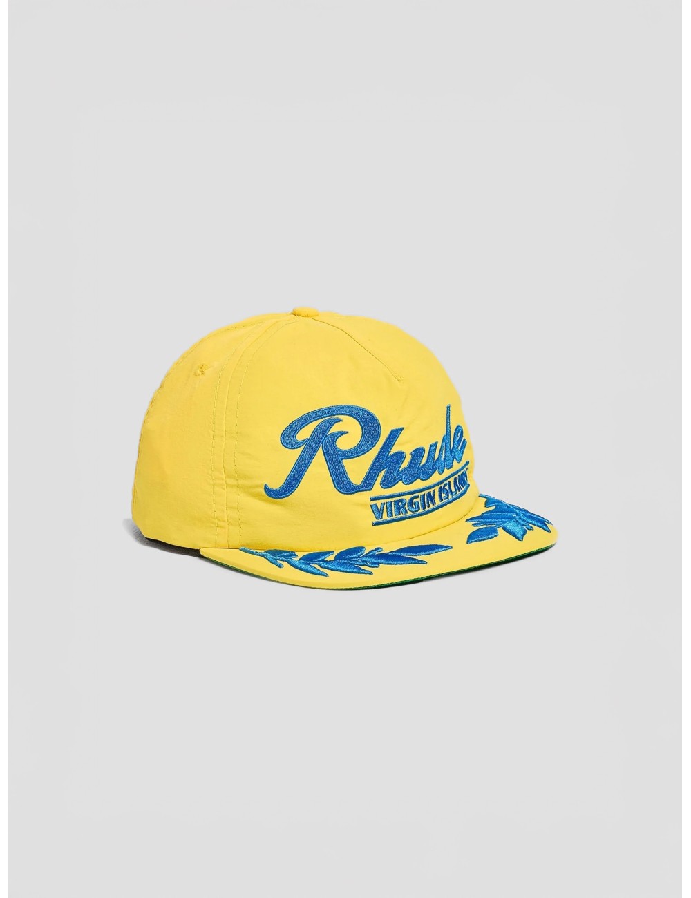 El logotipo “Rhude” en tipografía script aporta dinamismo al frontal, acompañado del texto “Virgin Islands” que refuerza la narrativa estética de la pieza. En la visera, los bordados en relieve introducen un guiño ornamental que equilibra el impacto cromático. El parche lateral añade un detalle distintivo que completa la composición visual.