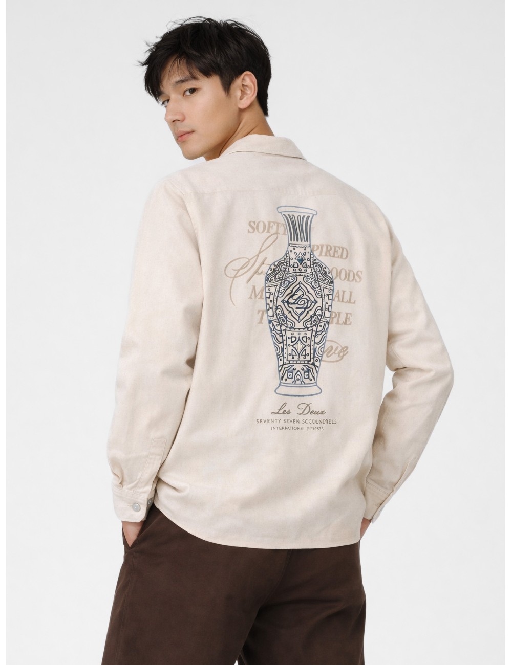El diseño frontal se mantiene sobrio, con un bolsillo en el pecho que incorpora el logotipo bordado de Les Deux. Esta simplicidad contrasta con el elemento protagonista del modelo: el gráfico Faience de gran formato situado en la espalda.