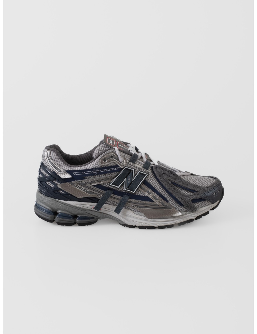 La 1906A de New Balance reinterpreta el lenguaje del running de los años 2000 desde una construcción más experimental, sin perder la base técnica que define la línea. En esta versión, el mesh gris claro aporta ligereza visual, mientras las superposiciones en grafito y magic blue construyen una superficie más densa, con relieve y una lectura claramente más gráfica. La imagen coincide con esa combinación de tonos fríos y con el SKU U19064F6 mostrado en la caja.