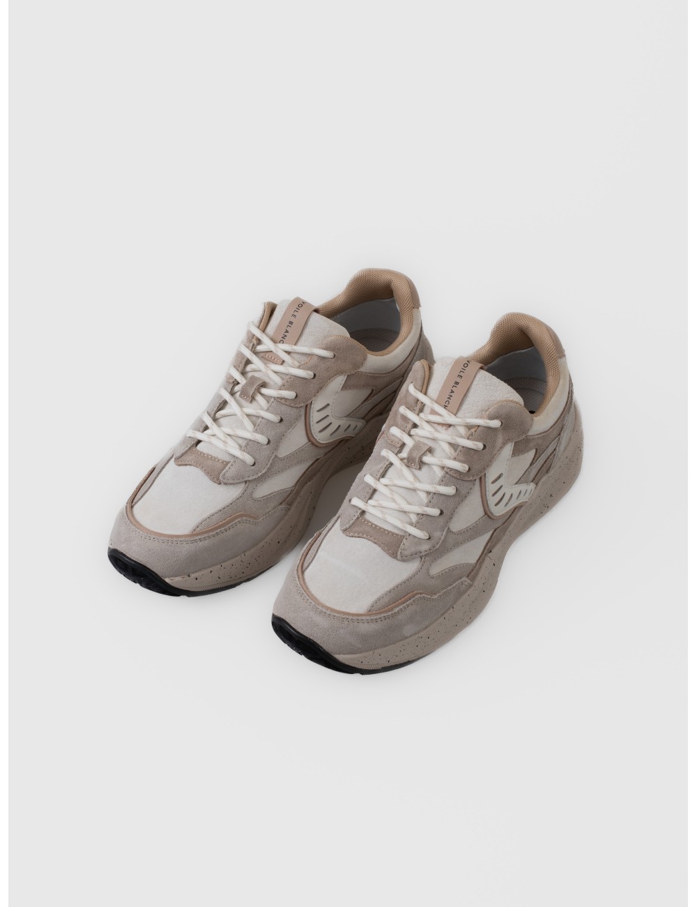 Zapatilla Voile Blanche Club22 en color ice/beige con construcción en washed leather. Presenta una silueta running de caña baja con paneles superpuestos en tonos neutros, cordones blancos y una mediasuela voluminosa con acabado jaspeado. El conjunto mantiene una imagen deportiva suave y contemporánea, fácil de integrar en un uso diario.