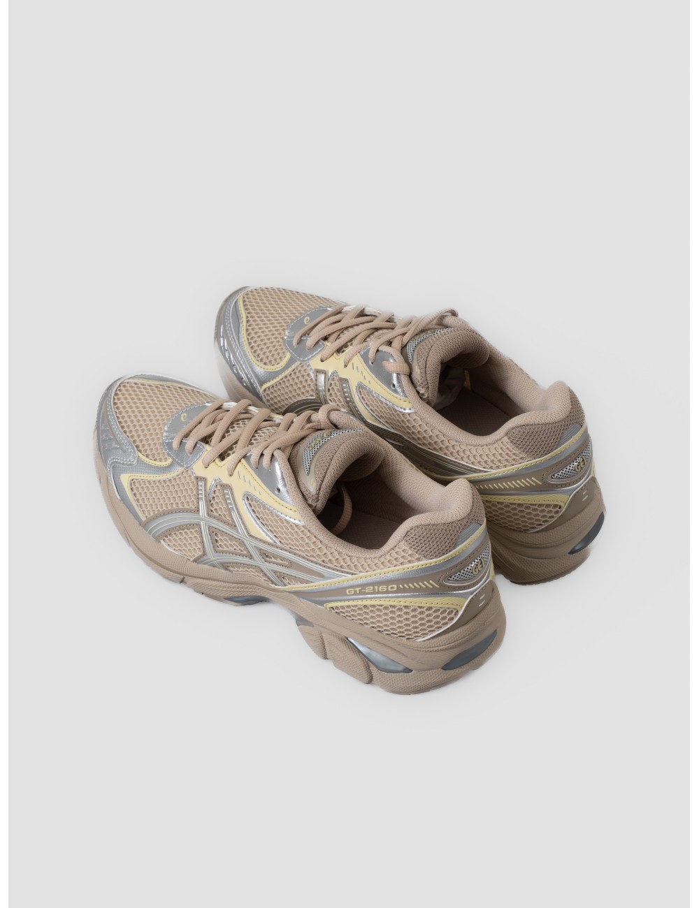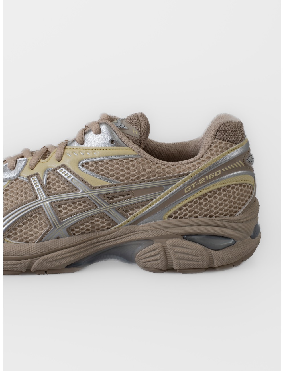 Zapatilla ASICS GT-2160 en color feather grey/pure silver. Combina base de malla transpirable con superposiciones sintéticas en acabado plateado y matices arena, manteniendo una silueta running de inspiración técnica. El conjunto incorpora cordones planos, estructura envolvente y una mediasuela de volumen marcado que refuerza su carácter deportivo y su uso diario.