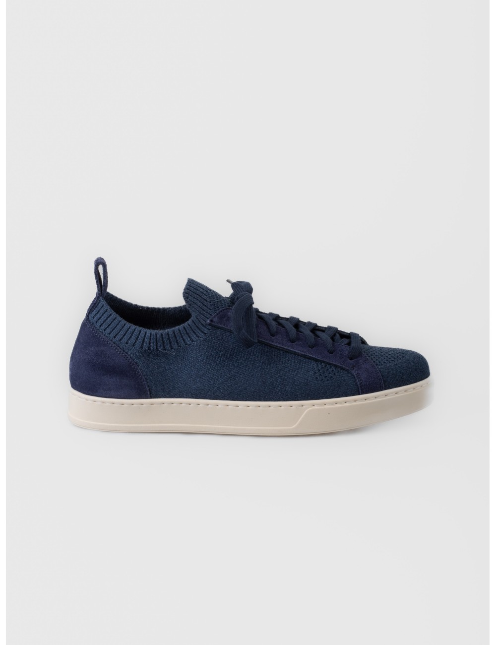 Detalles: Zapatilla baja; cuello tipo calcetín; cordones al tono; paneles de ante; tirador trasero; suela off-white