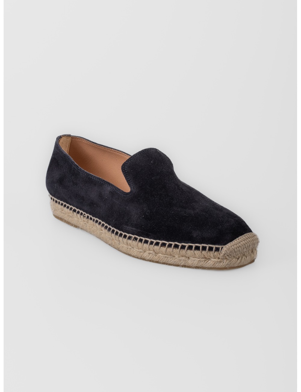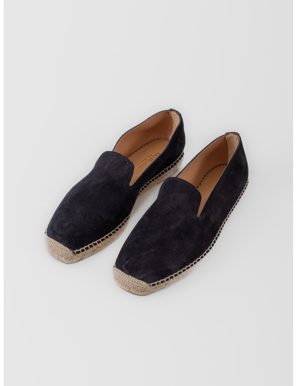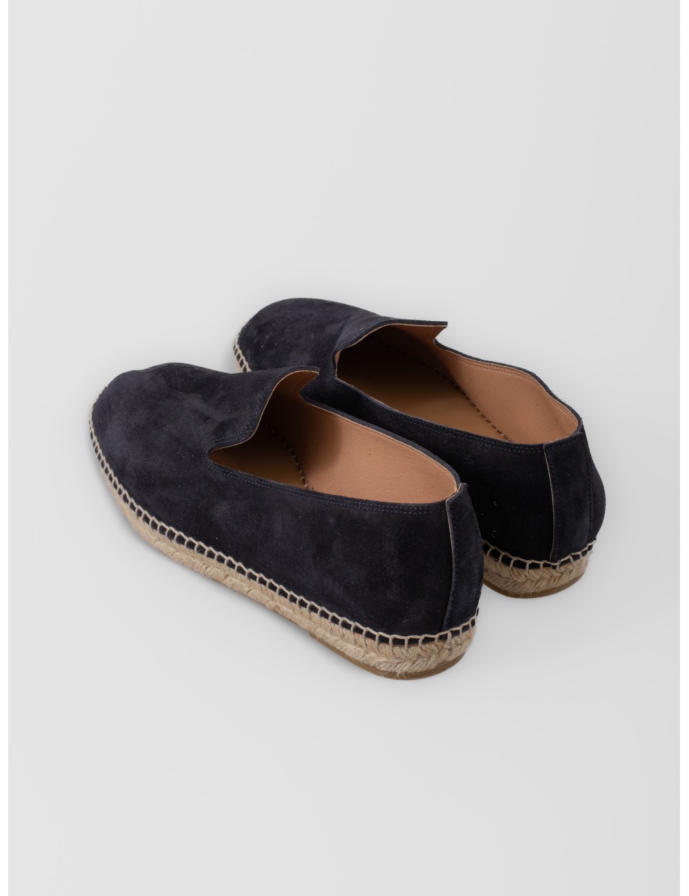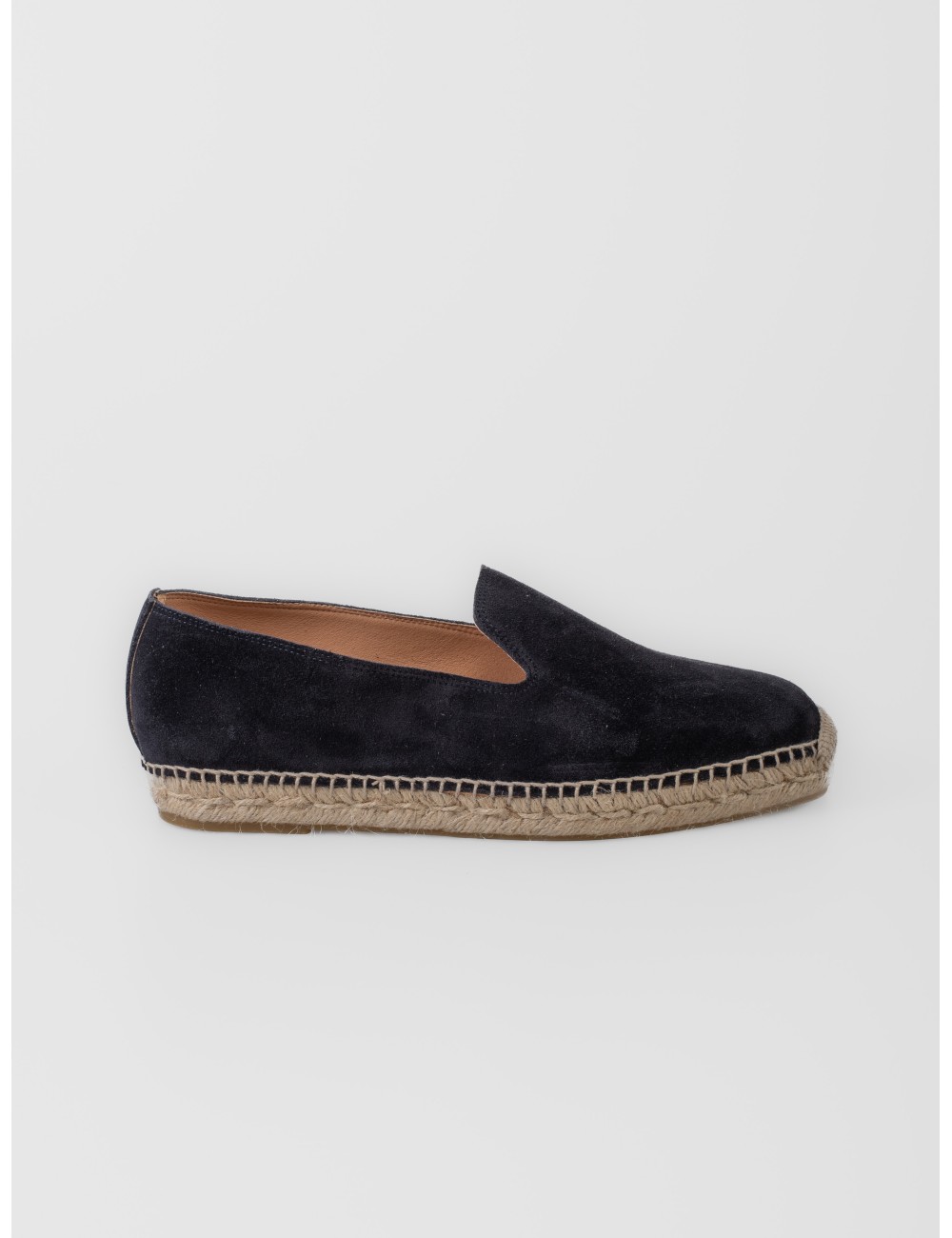 Alpargata Les Héritiers Futadera en azul marino con silueta limpia y construcción slip-on. Realizada en piel de acabado afelpado, presenta escote amplio, puntera redondeada y base tradicional de yute trenzado. Su perfil depurado y el contraste natural de la suela refuerzan una estética sobria y versátil para el verano.