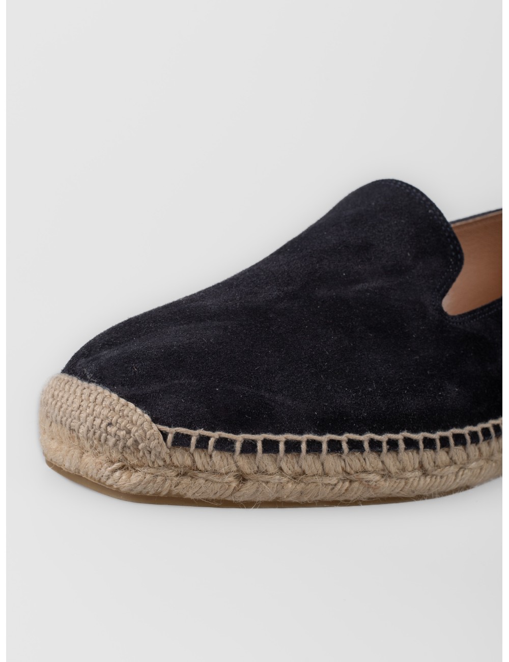 La imagen muestra una superficie en piel con acabado afelpado. La base está rematada con yute trenzado, un rasgo clásico en este tipo de calzado.
