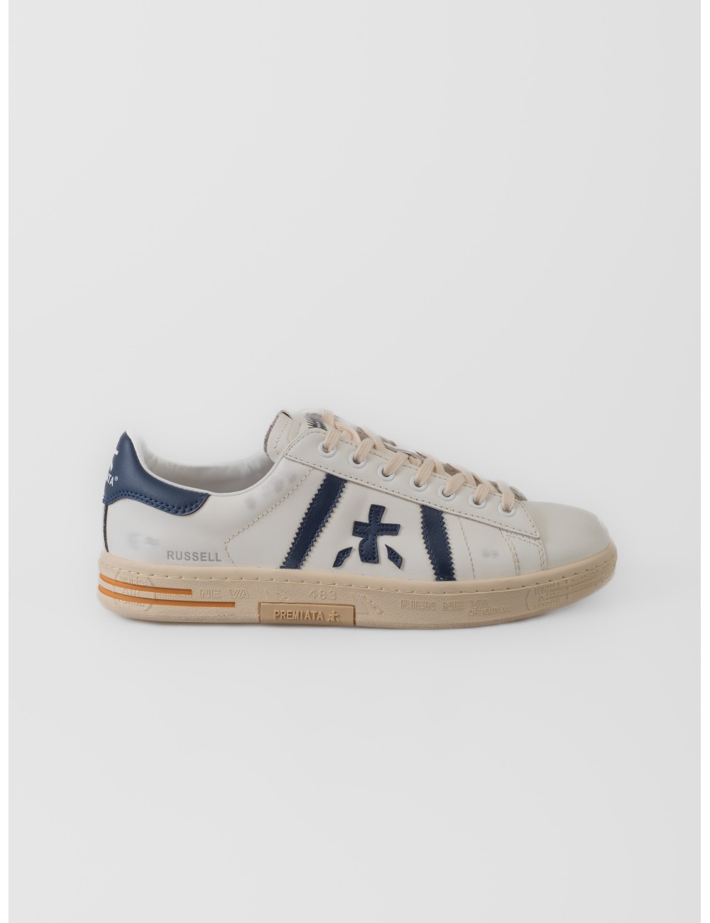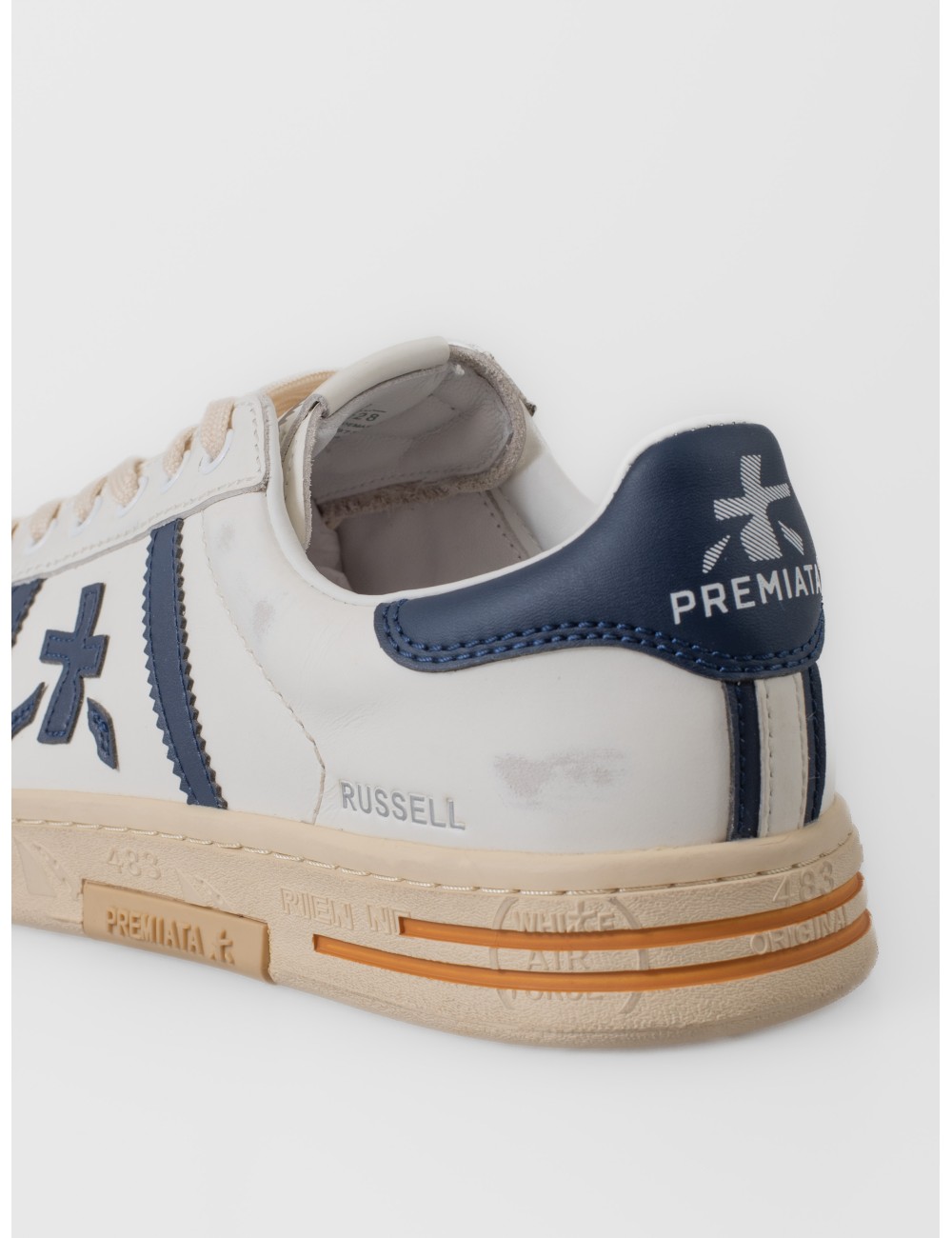 Características técnicasZapatilla blanca y azul Premiata Russell 8028 con paneles en contraste y suela gráfica