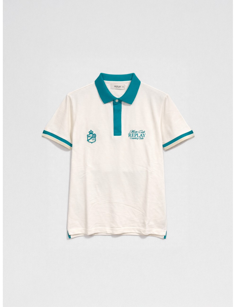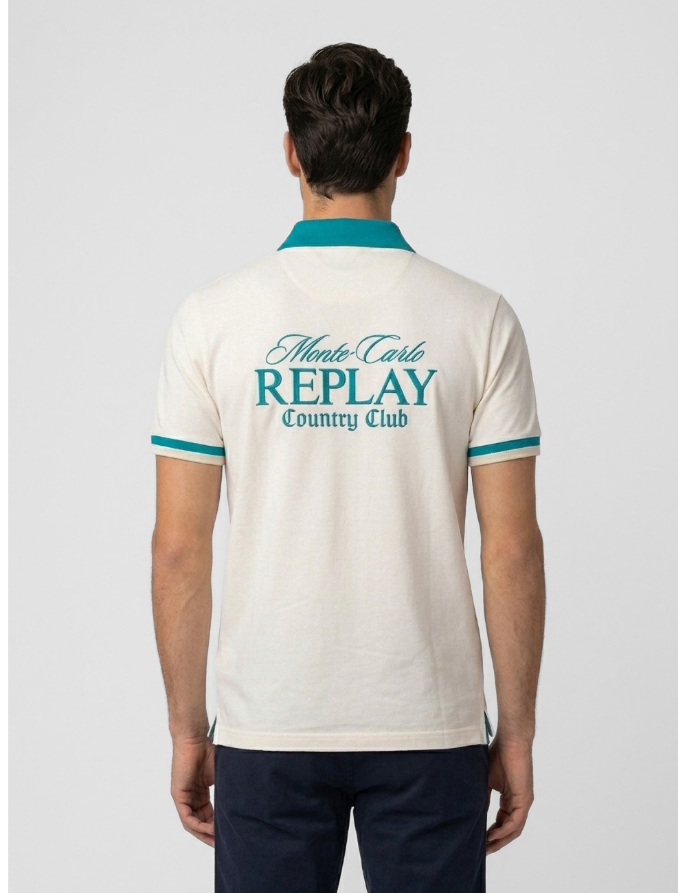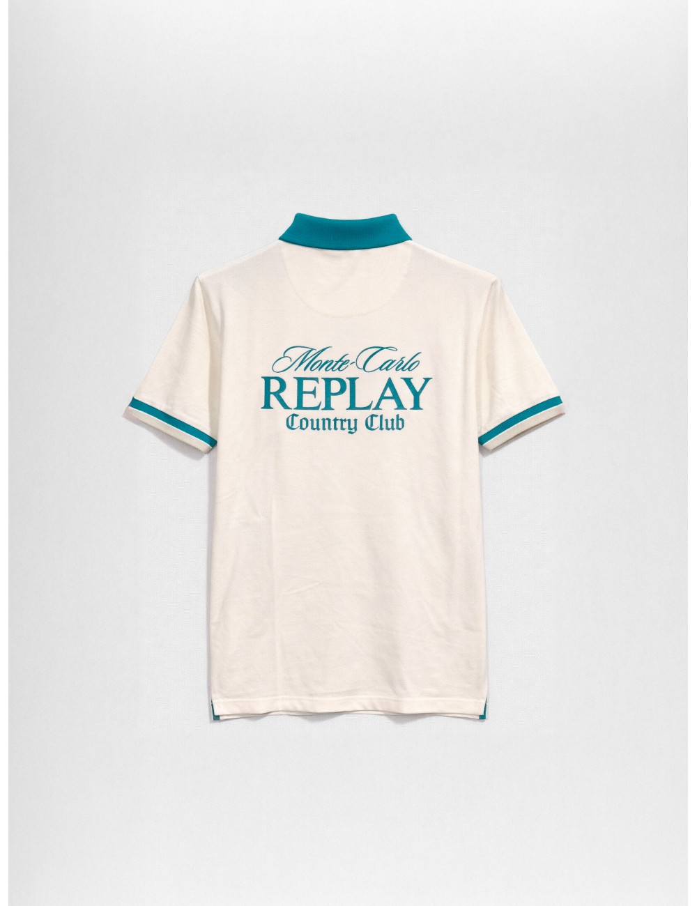 Polo Replay Monte Carlo Country Club Collection para hombre en color Gardenia. Confeccionado en piqué de algodón elástico, combina base blanca con cuello, tapeta y vivos turquesa. Presenta bordado tipográfico en el pecho, parche aplicado con escudo y gráfico maxi en la espalda, dentro de una construcción clásica de manga corta y perfil deportivo.