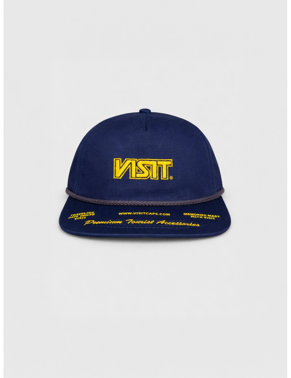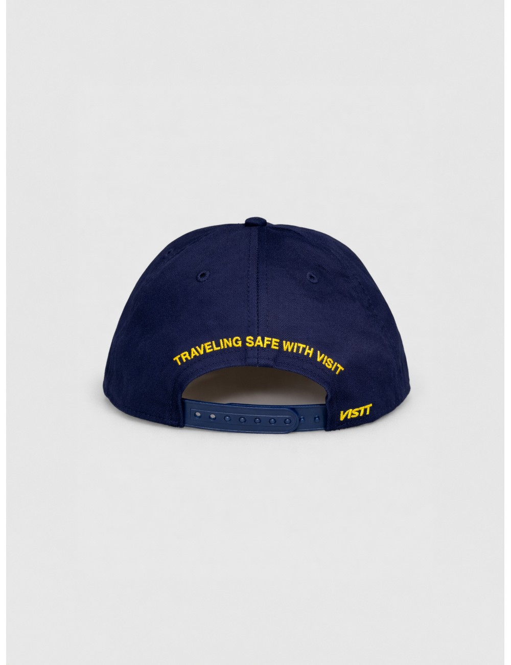 Gorra VISIT Guide 001 en color navy con bordado frontal y detalles gráficos sobre la visera. Su construcción de cinco paneles, la visera plana y el cordón frontal definen una silueta limpia y precisa. El contraste entre la base azul marino y el bordado amarillo aporta una lectura gráfica clara y de uso cotidiano.