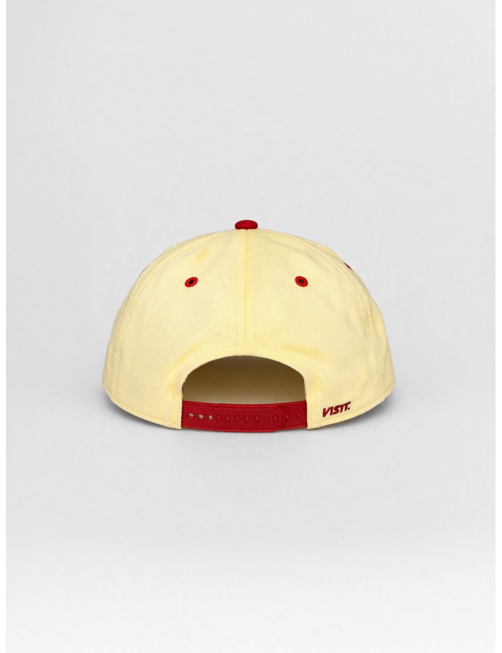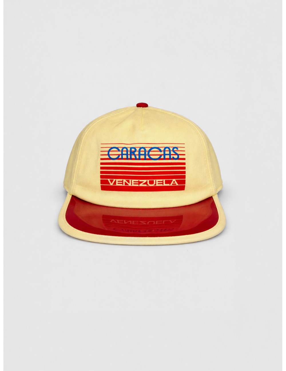 Gorra VISIT Caracas 001 en color yellow con gráfico frontal en contraste y visera roja brillante. Su construcción de seis paneles, la copa estructurada y la visera plana definen una silueta limpia y marcada. La combinación de amarillo suave, rojo intenso y detalle azul refuerza el carácter gráfico de una pieza de uso cotidiano.