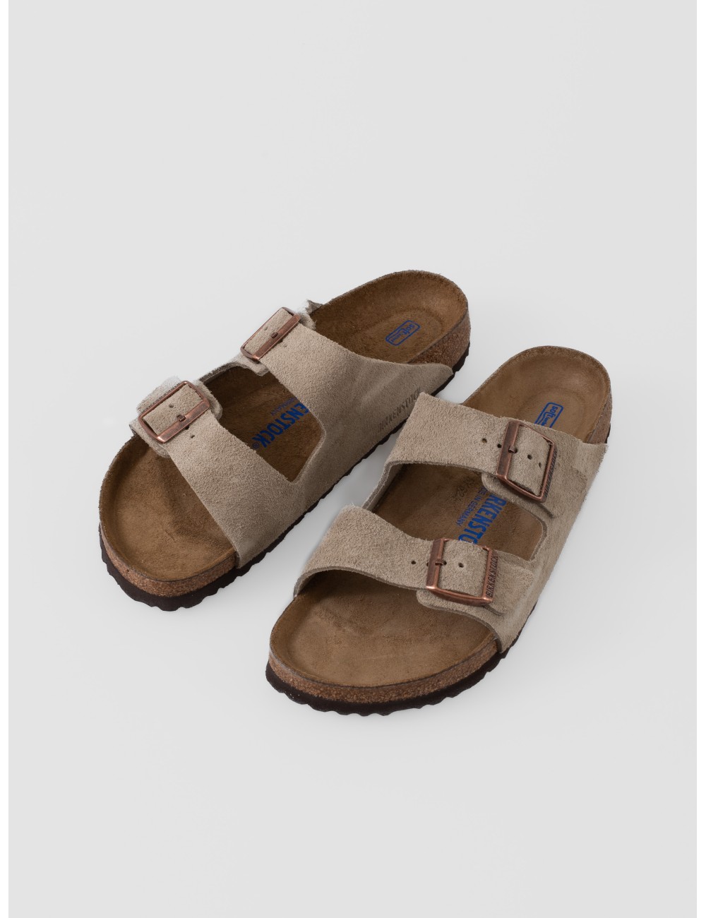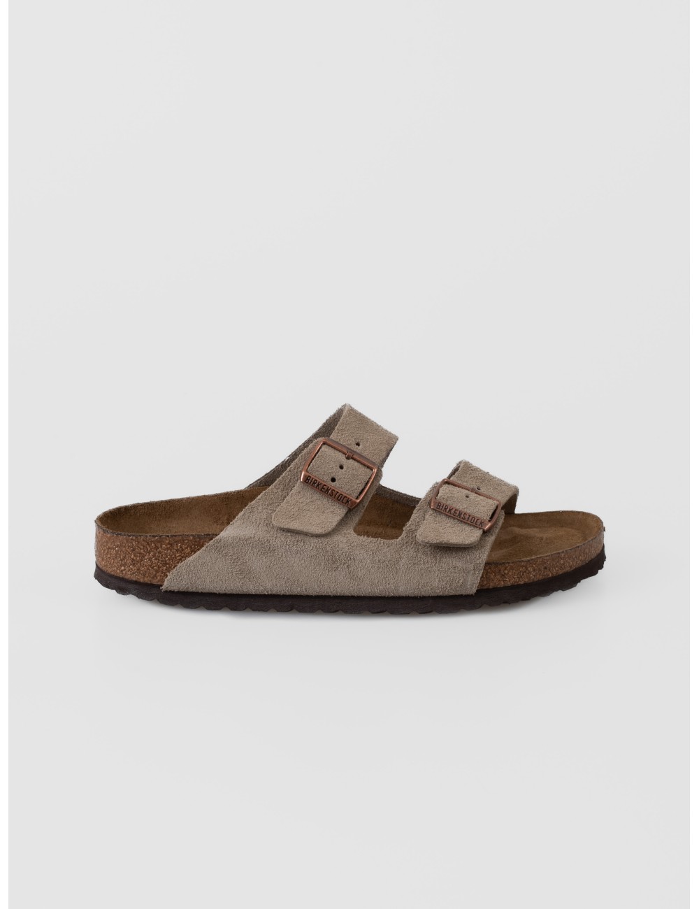Sandalia BIRKENSTOCK Arizona BS Soft Footbed en taupe, diseñada para el uso diario con dos correas ajustables y ajuste estrecho. La pala de ante, la plantilla anatómica blanda y la suela ligera combinan comodidad, sujeción y una pisada estable en climas cálidos o en interiores durante todo el año.