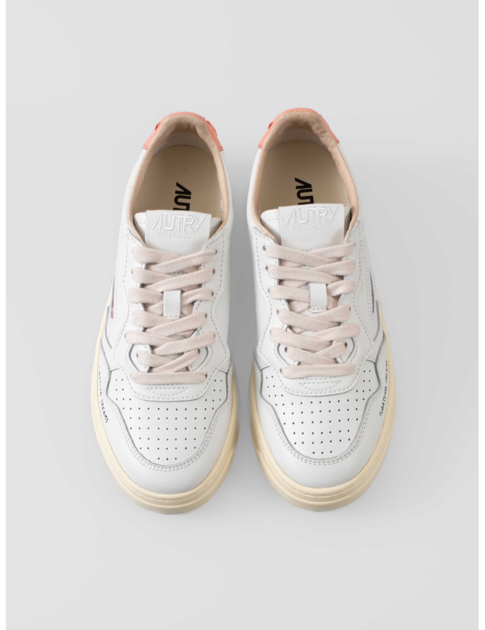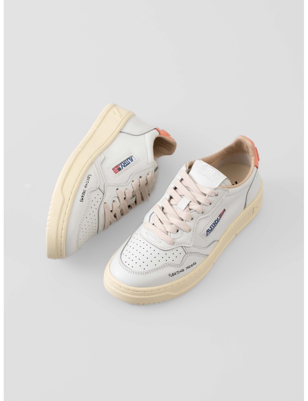 Zapatillas Autry Medalist Low para mujer en color White/Peachp, confeccionadas en piel suave con talonera en tono melocotón. Un diseño retro y femenino que combina comodidad, estilo atemporal y un toque de color sutil.
