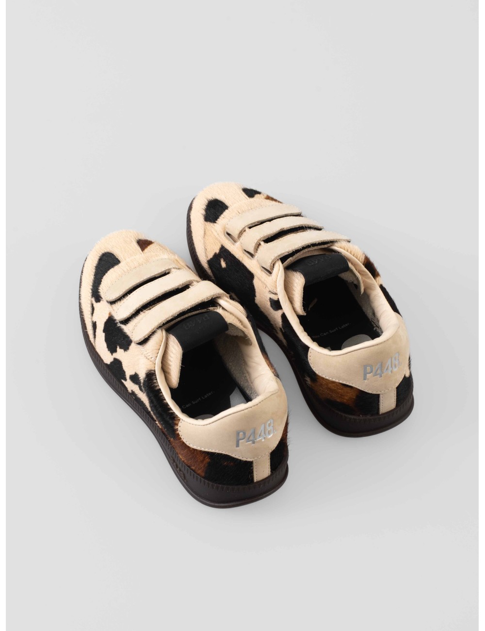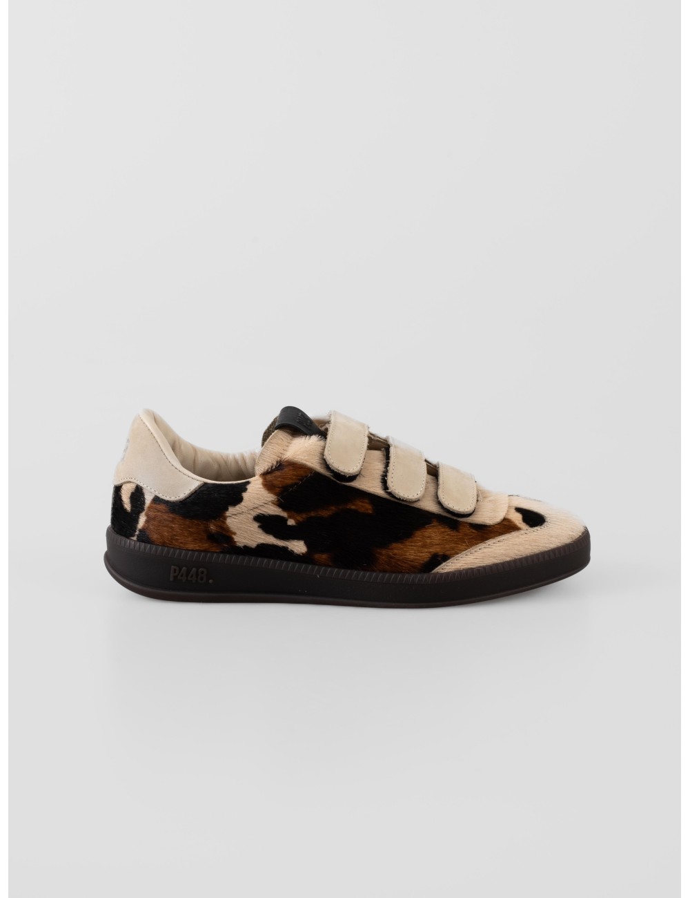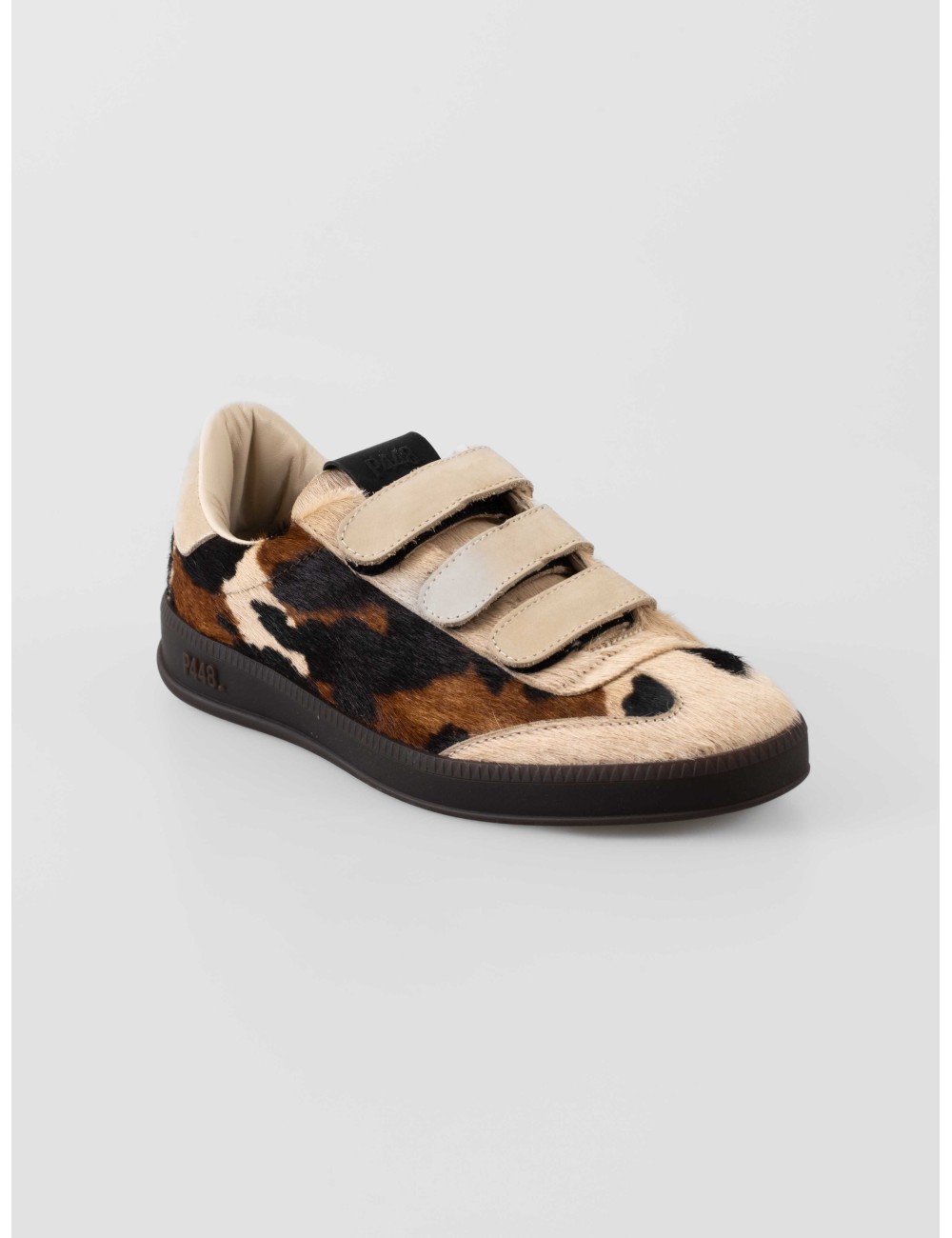 Zapatillas P448 Capri 12 para mujer en acabado pony hair efecto leopardo y detalles en ante camel. Un modelo distintivo, cómodo y con cierre de velcro para un estilo urbano moderno y versátil.