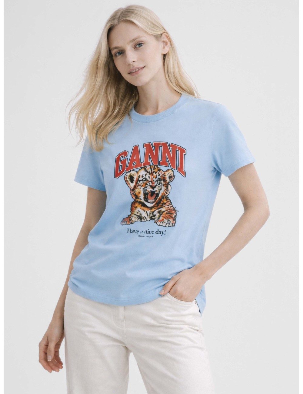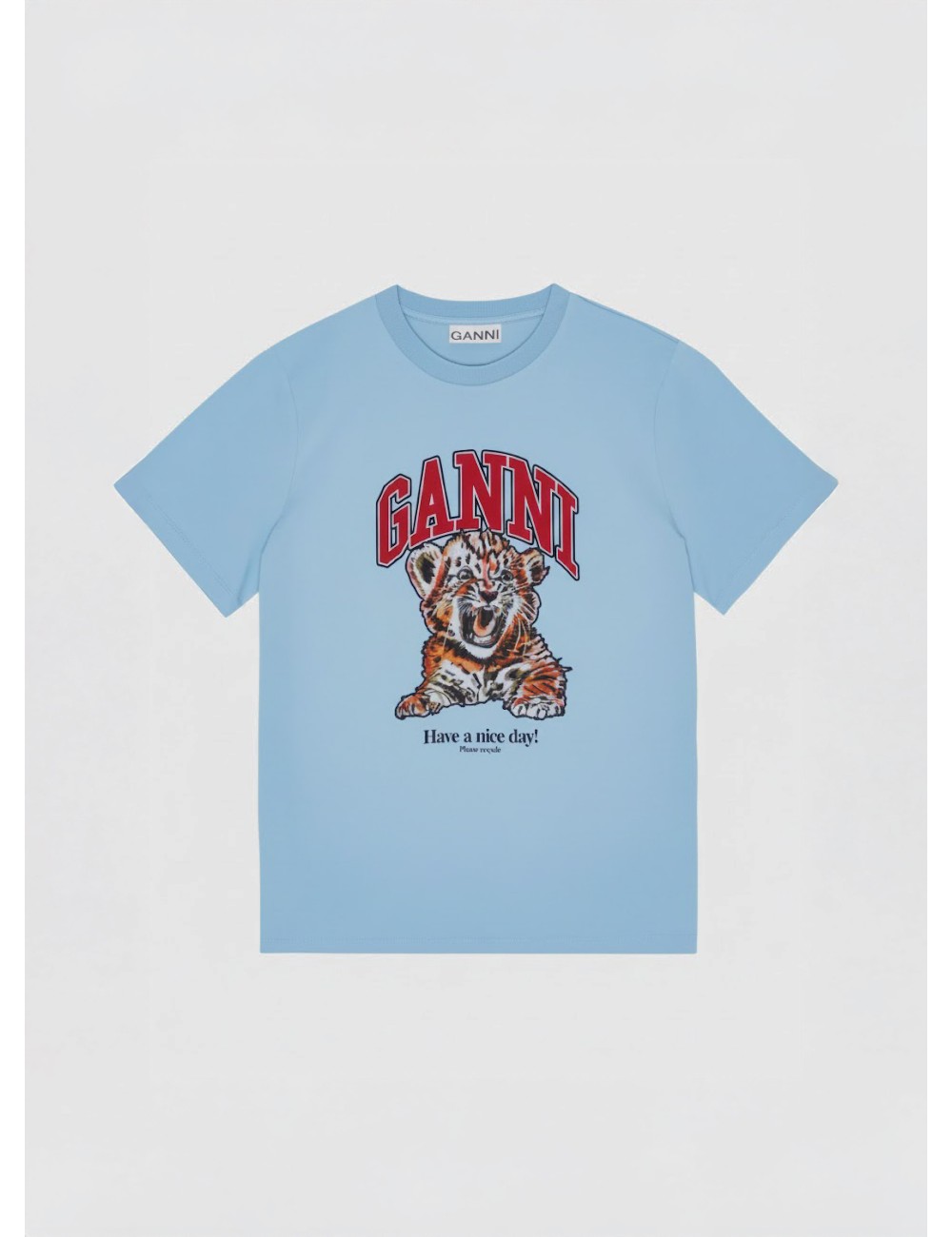 En MARFRANC presento la camiseta GANNI Blue Relaxed Tiger T-shirt en algodón orgánico Blissful Blue para mujer, un básico relajado con carácter gráfico.