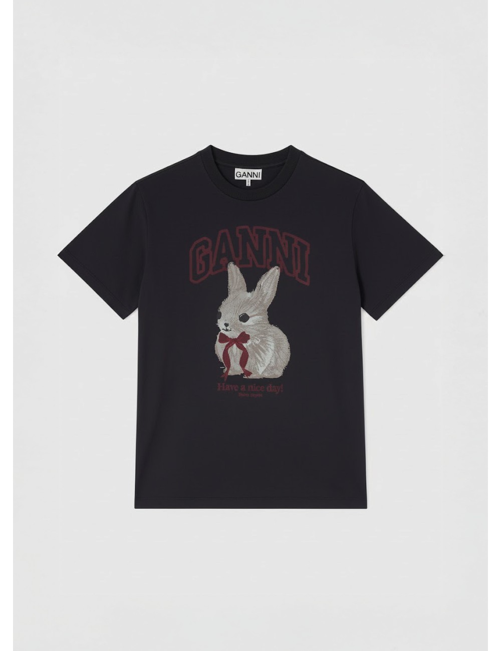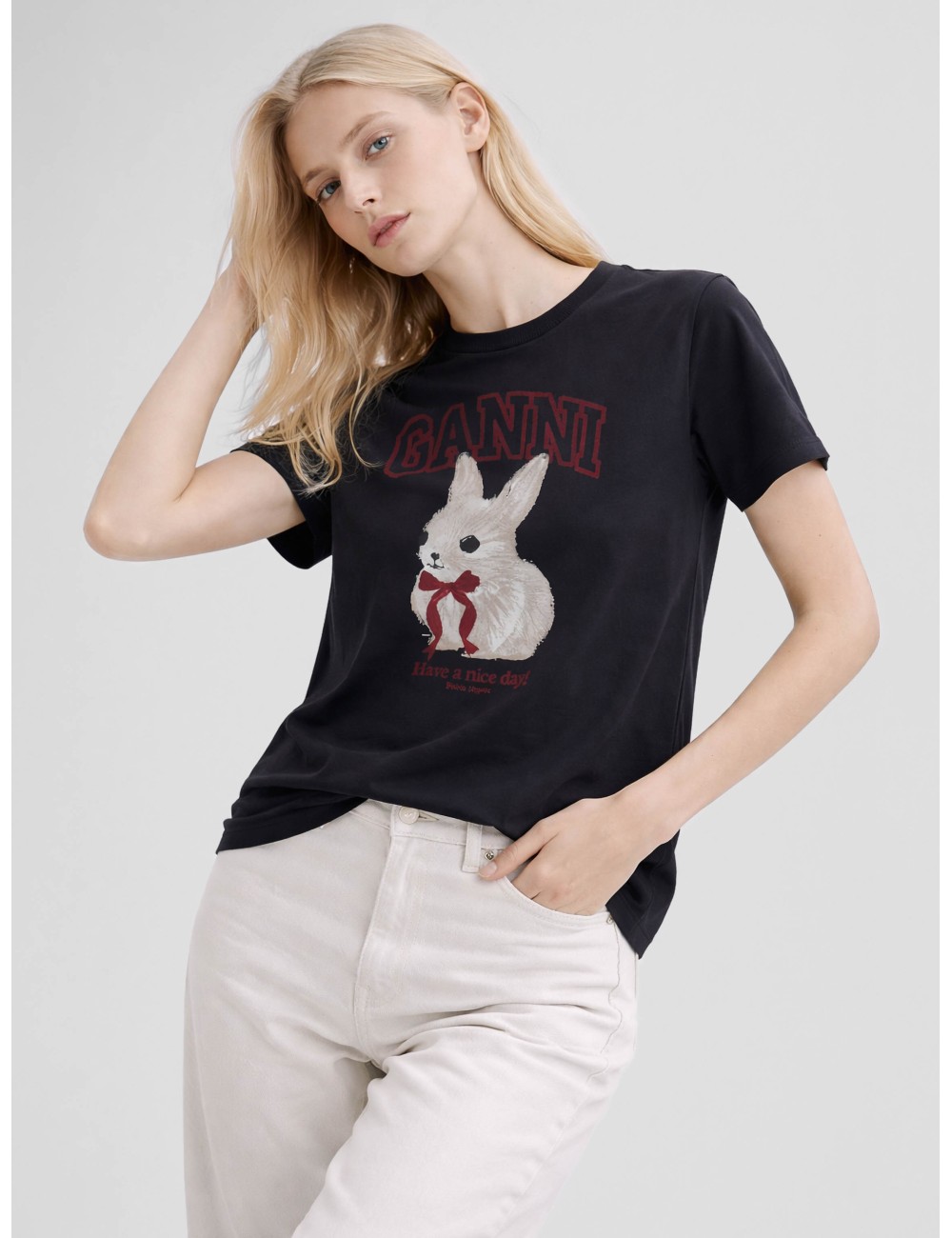 En MARFRANC presento la camiseta GANNI Grey Bunny T-shirt A1050061 en algodón orgánico color Phantom para mujer, un básico gráfico de encanto sofisticado. Esta prenda de fit relajado, cuello redondo acanalado y manga corta se distingue por el estampado frontal de conejo con logo GANNI, pensada para elevar looks casuales con un toque lúdico y contemporáneo. Ideal para mujeres que buscan una camiseta negra versátil y cómoda.