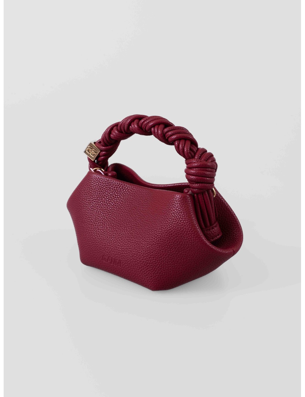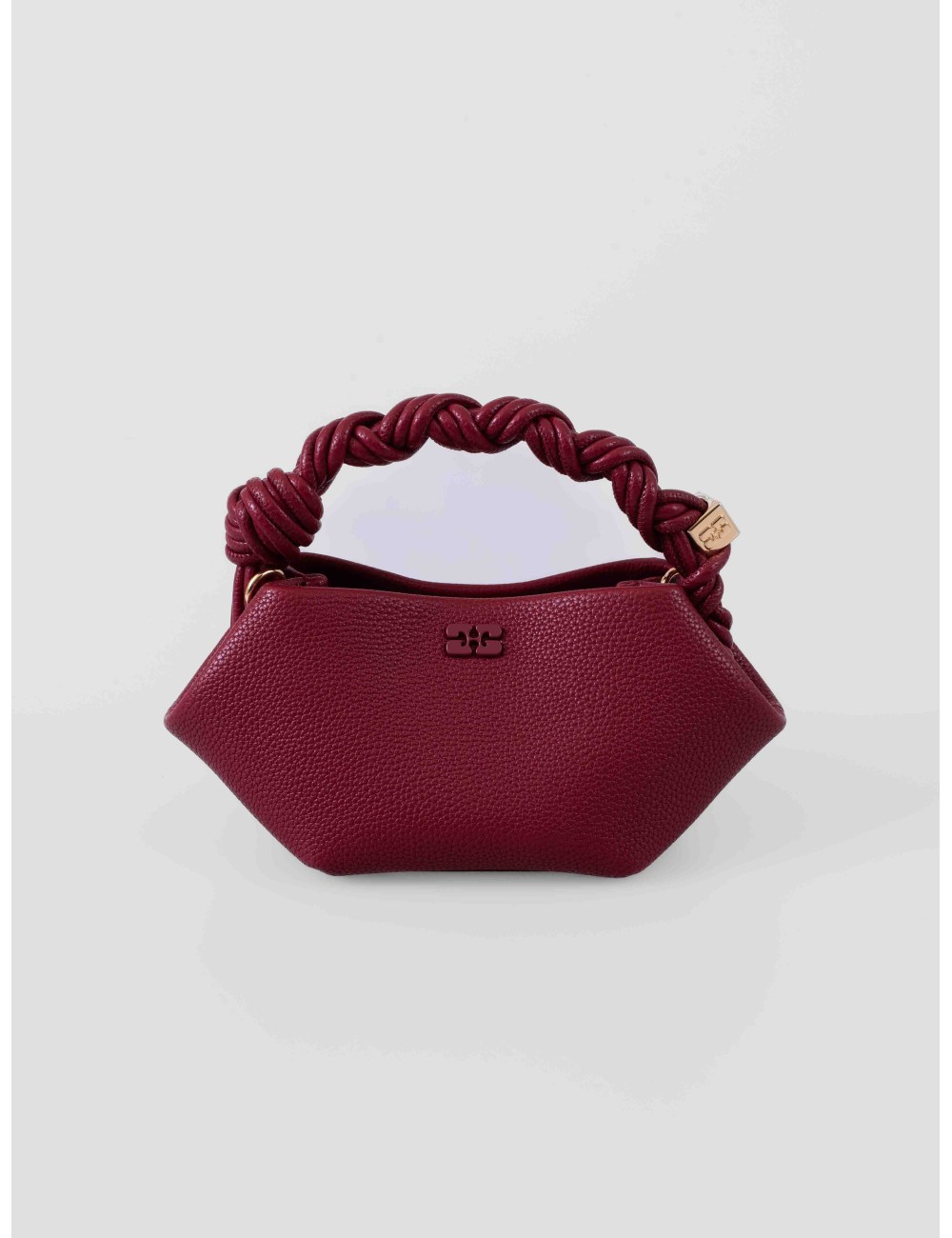 Bolso mini de piel granulada de GANNI en color burdeos, con asa trenzada escultórica y logotipo en relieve. Minimalismo con carácter escandinavo.