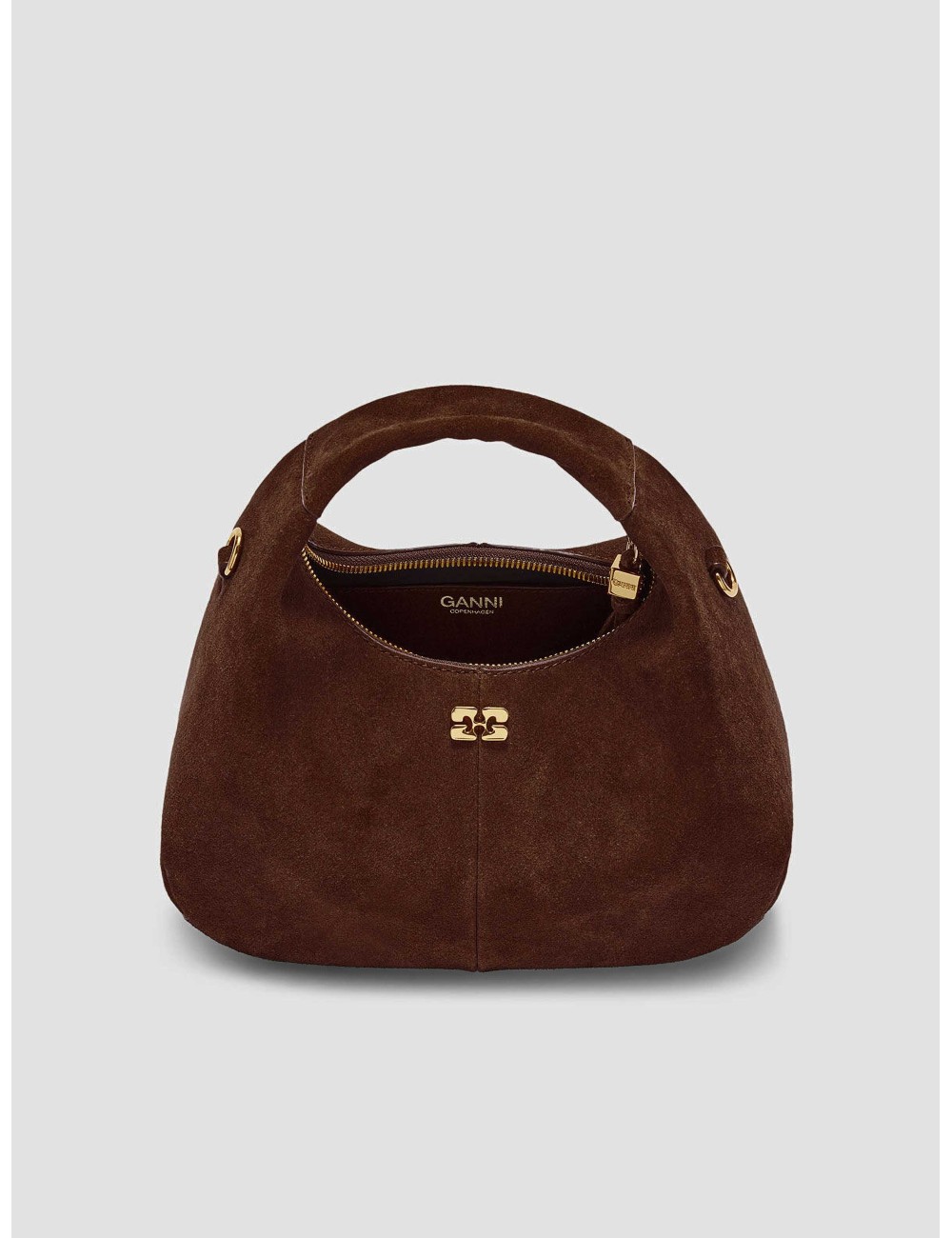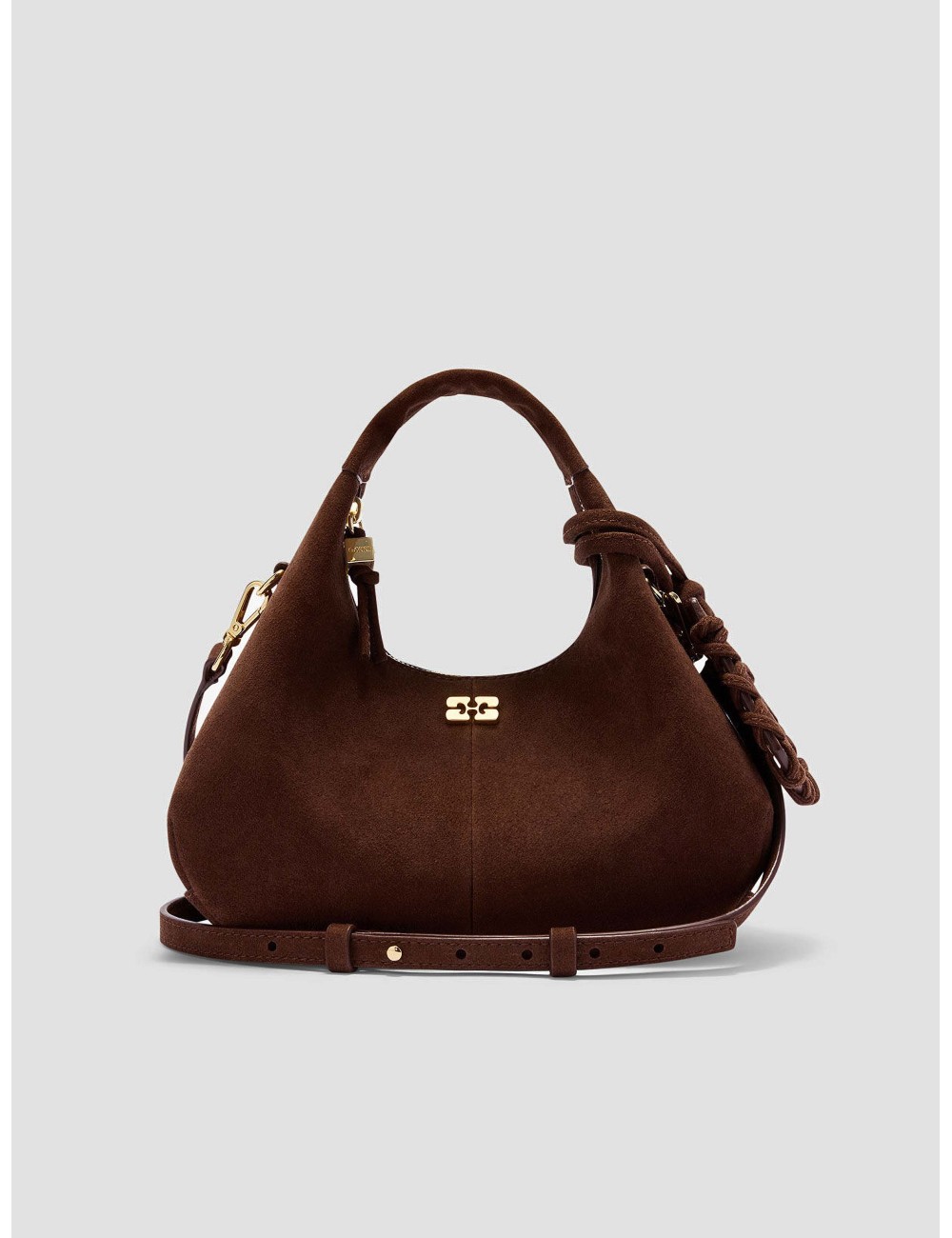 En MARFRANC incorporamos el bolso GANNI B2070016 de mujer en Chicory Coffee, un mini hobo bag en ante Pelinova que destaca por su silueta compacta y detalles dorados. Con asa superior y correa desmontable, se adapta tanto para llevar a mano como al hombro.