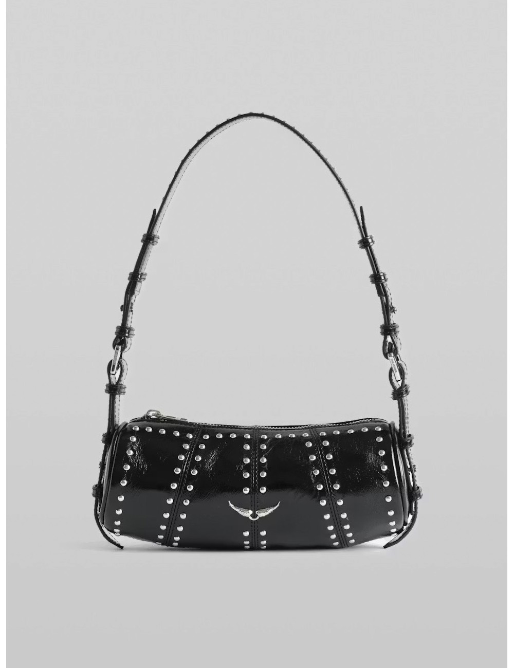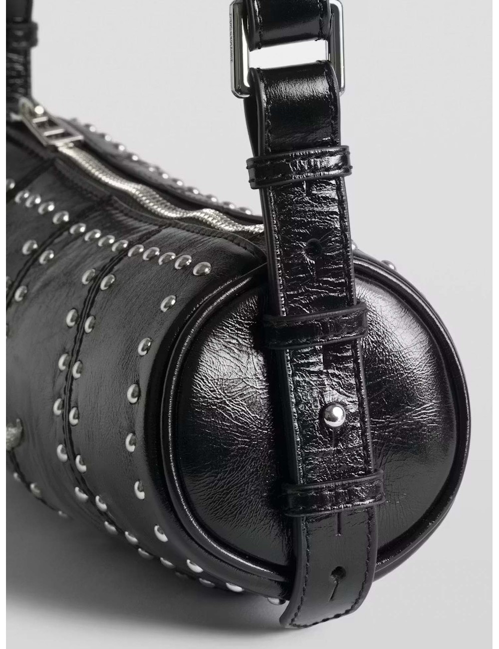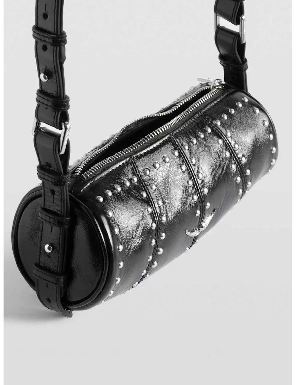 En MARFRANC ofrecemos el bolso Zadig & Voltaire LWBA04177 de mujer en negro, conocido como Le Roudoudou Studs, con su icónica forma cilindrica y tachuelas plateadas. Este modelo en piel patentizada vintage combina rock y elegancia en un formato compacto.