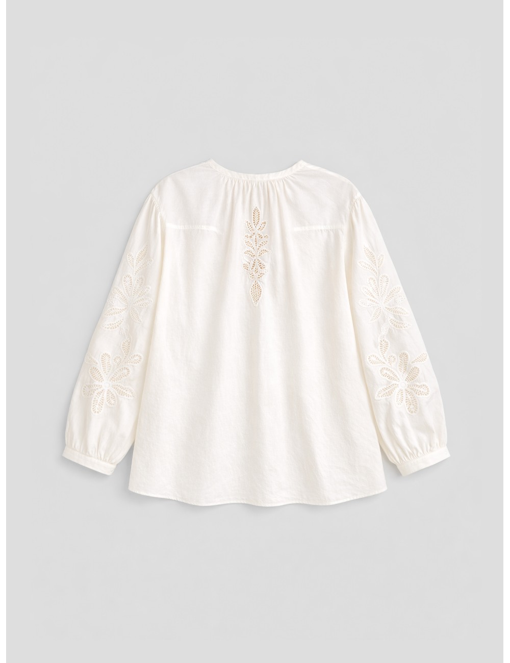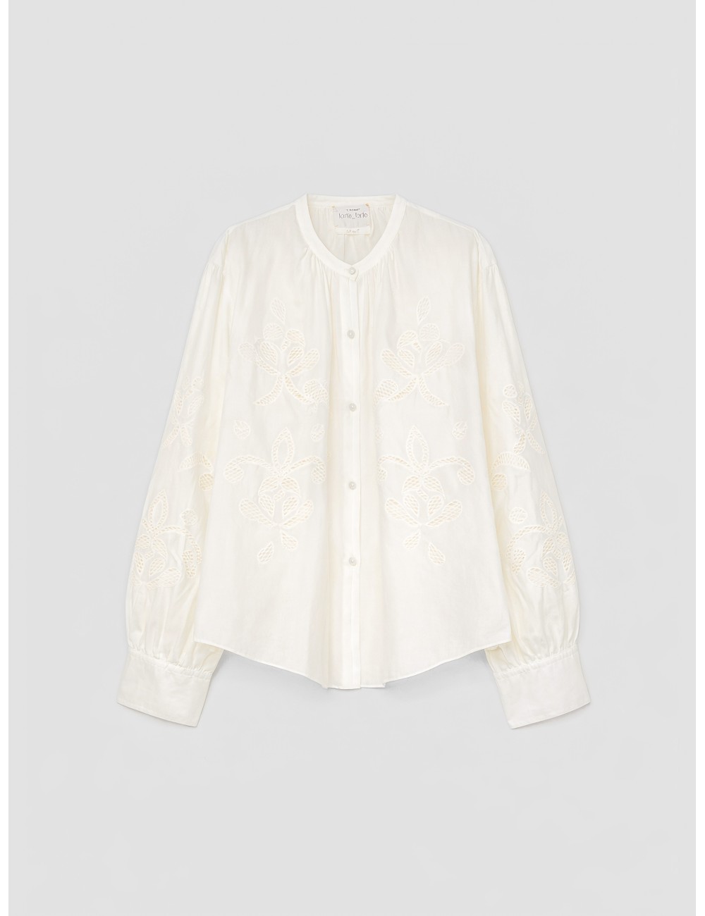 Hemos incorporado esta bohemian voile shirt de forte_forte por su delicadeza artesanal, donde el voile translúcido y bordados lunamaris celebran la feminidad etérea sin esfuerzo.