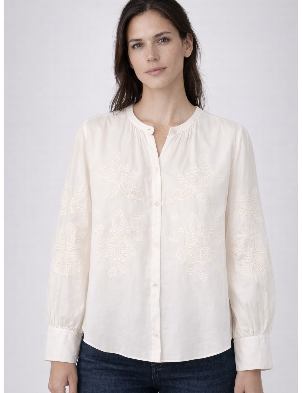 En MARFRANC destacamos la bohemian voile shirt with “lunamaris” embroidery de forte_forte para mujer en avorio, camisa fluida bordada con motivos lunamaris que evoca artesanía italiana sutil.