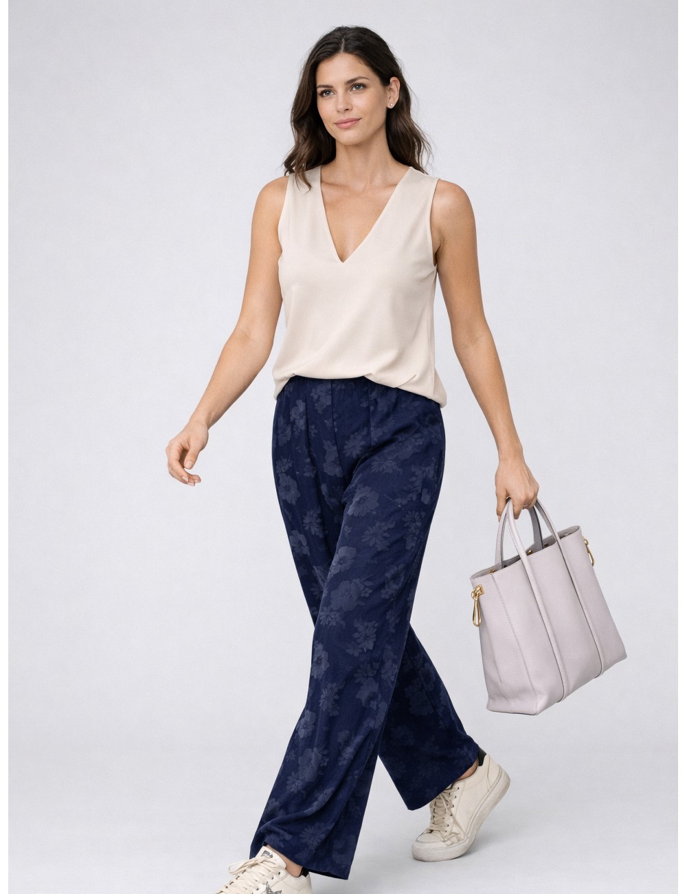 La viscosa jacquard satelital cae con volumen elegante, tacto noble y breathability para uso extendido. Su cintura alta y bocas anchas estilizan piernas, ideal con tops cropped o blusas sueltas.