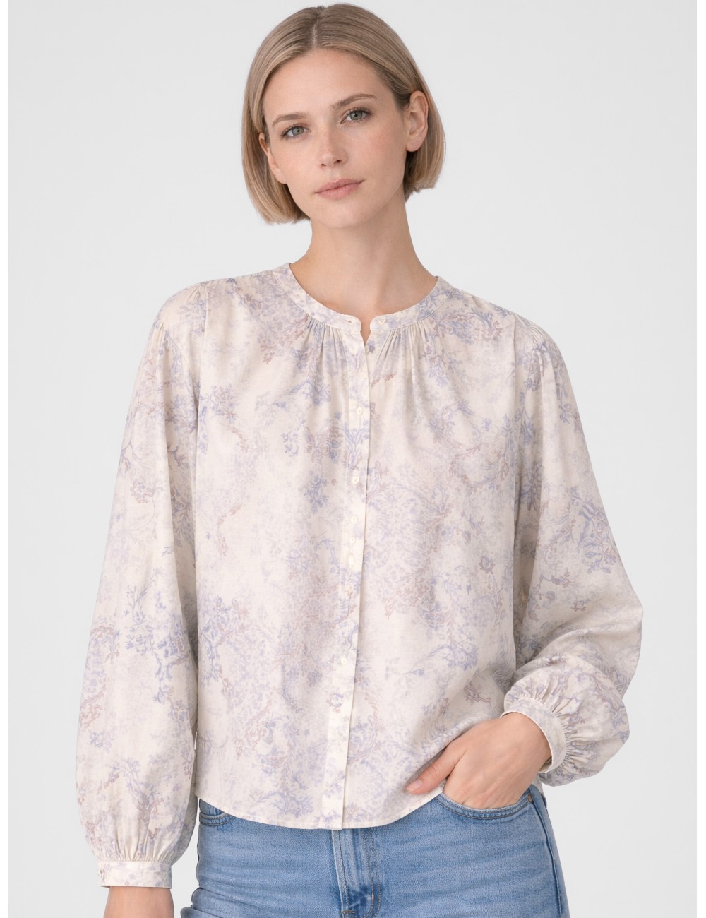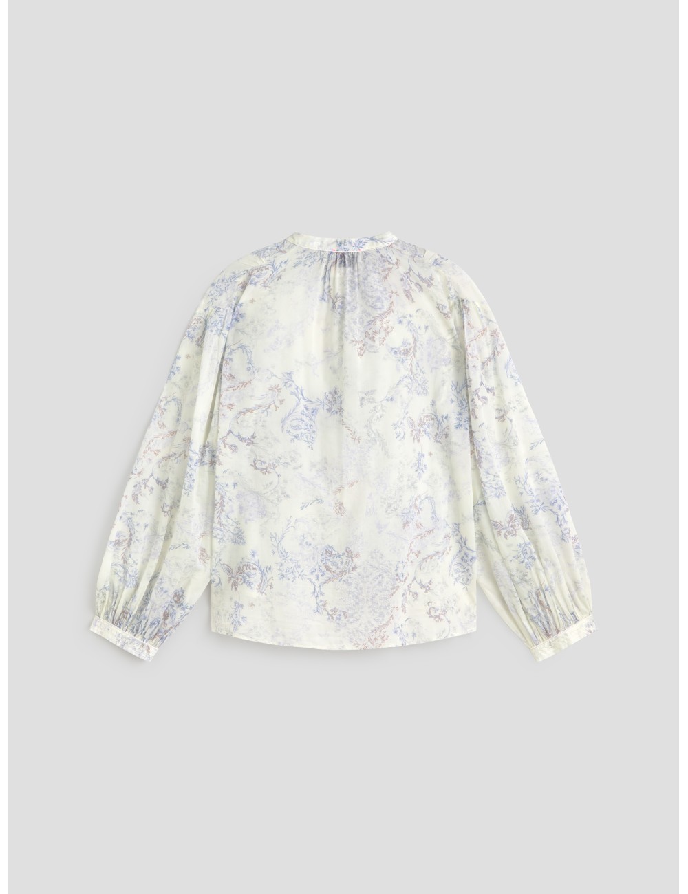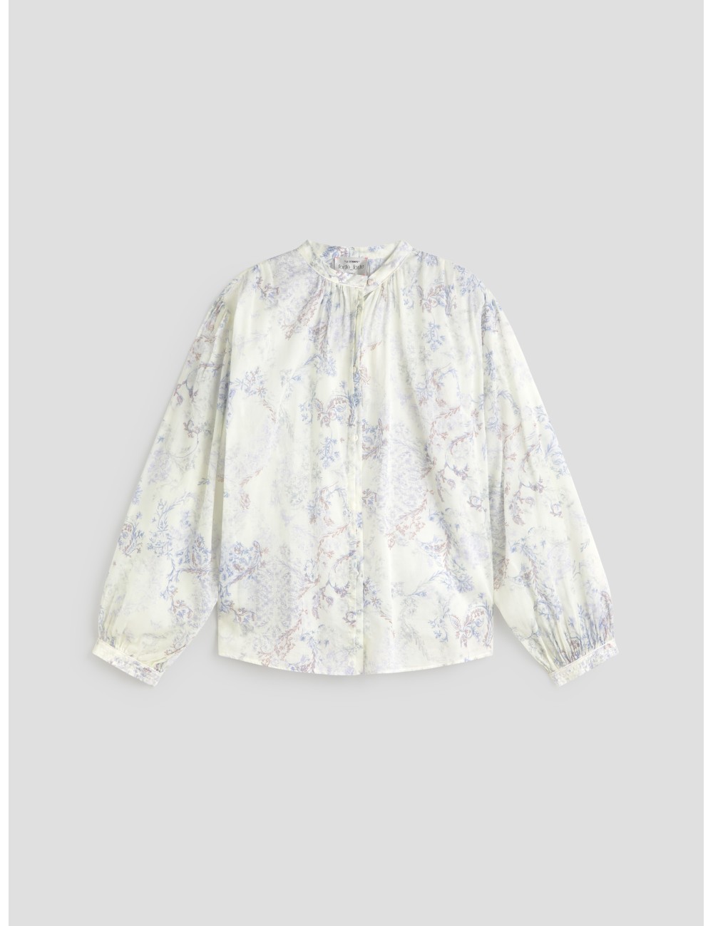 Hemos incluido esta camisa Forte Forte en selección por su drapeado bohemio effortless, donde el voile floral glicine infunde ligereza poética a estilismos diarios.