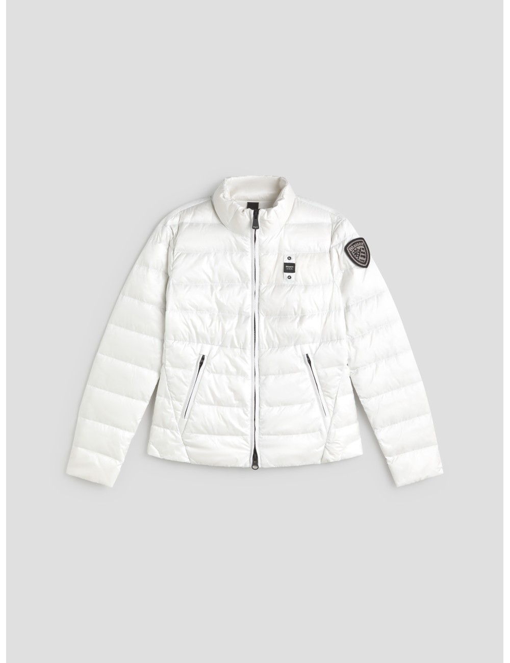 ¿Cómo es la sensación y materiales del piumino blanco nieve Blauer USA para mujer?