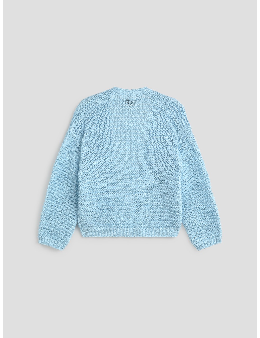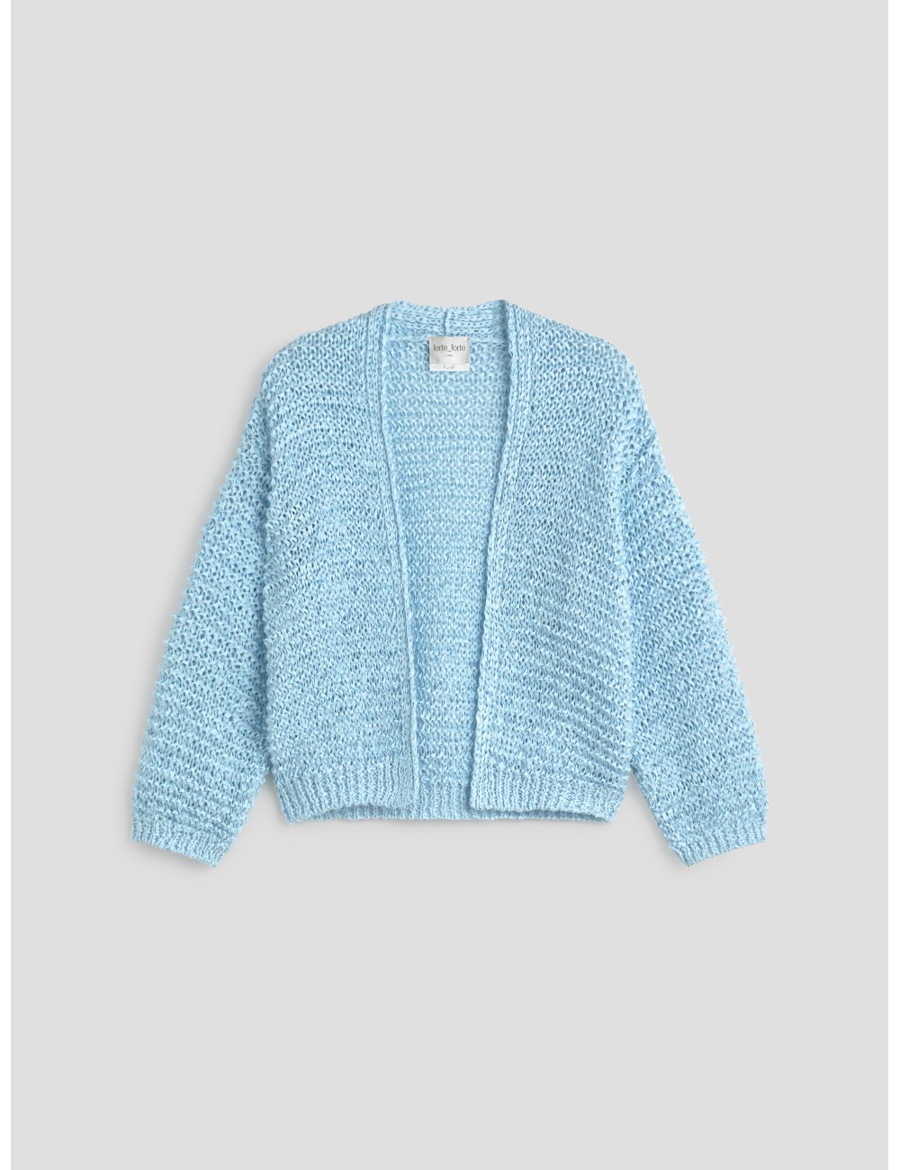 Cardigan forte_forte 14666 color Azure para mujer, confeccionado en punto calado de textura ligera con silueta relajada y caída suave. Diseño abierto de inspiración artesanal que aporta ligereza, volumen y un matiz etéreo a estilismos de entretiempo.