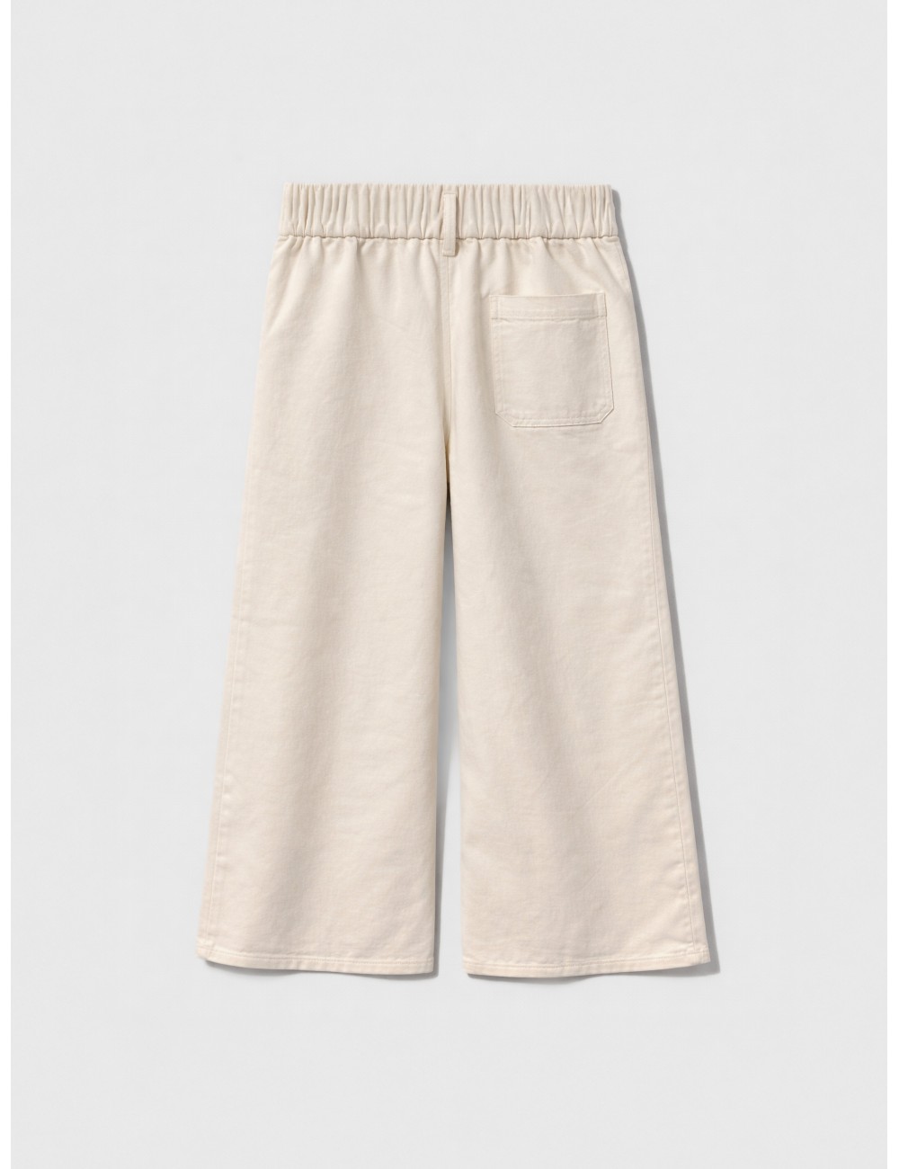 Confeccionado en algodón de estructura consistente y tacto suave, mantiene la forma sin perder fluidez. La cintura elástica fruncida define suavemente el talle y facilita el ajuste, generando un contraste armónico con la amplitud de la pierna. El tiro medio contribuye a una silueta natural y cómoda, adecuada para el uso diario.