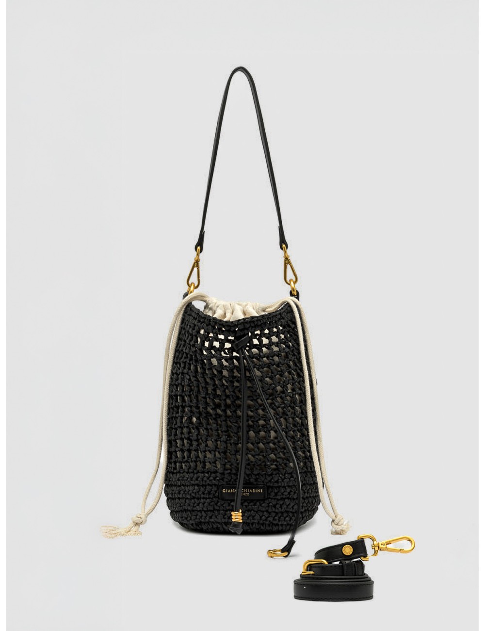 El Nefeli Bag de Gianni Chiarini Firenze combina tradición artesanal y funcionalidad contemporánea en un formato tipo bucket. Su estructura cilíndrica está elaborada en rafia trenzada con efecto crochet, generando un entramado abierto que aporta textura y ligereza visual.
