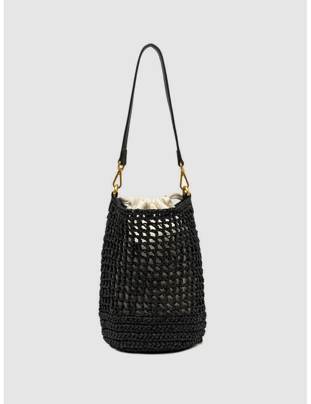 El contraste entre el cuerpo en negro y el forro interior en tono claro realza el carácter estival del diseño. El cierre fruncido mediante cordón protege el contenido sin alterar la fluidez de la silueta, mientras que los detalles en piel y los herrajes dorados introducen un acabado refinado.