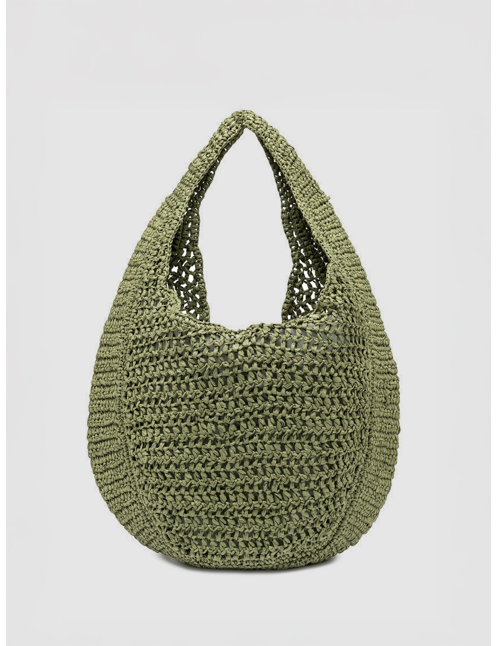 El tono verde Taiga refuerza su carácter orgánico y versátil, fácil de integrar en estilismos neutros o en combinaciones más estivales. La asa integrada permite llevarlo cómodamente al hombro, acompañando la caída natural del tejido.