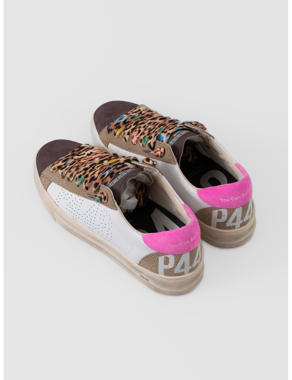 El lateral perforado conserva uno de los rasgos más reconocibles del modelo, y los cordones estampados prolongan ese juego gráfico sin romper la limpieza del conjunto. La suela de goma con acabado hand-distressed añade una lectura más vivida y menos rígida, manteniendo la identidad característica de P448. La imagen coincide con la combinación de piel blanca, puntera marrón, ribetes beige, talón fucsia y cordones multicolor descrita en la ficha oficial.