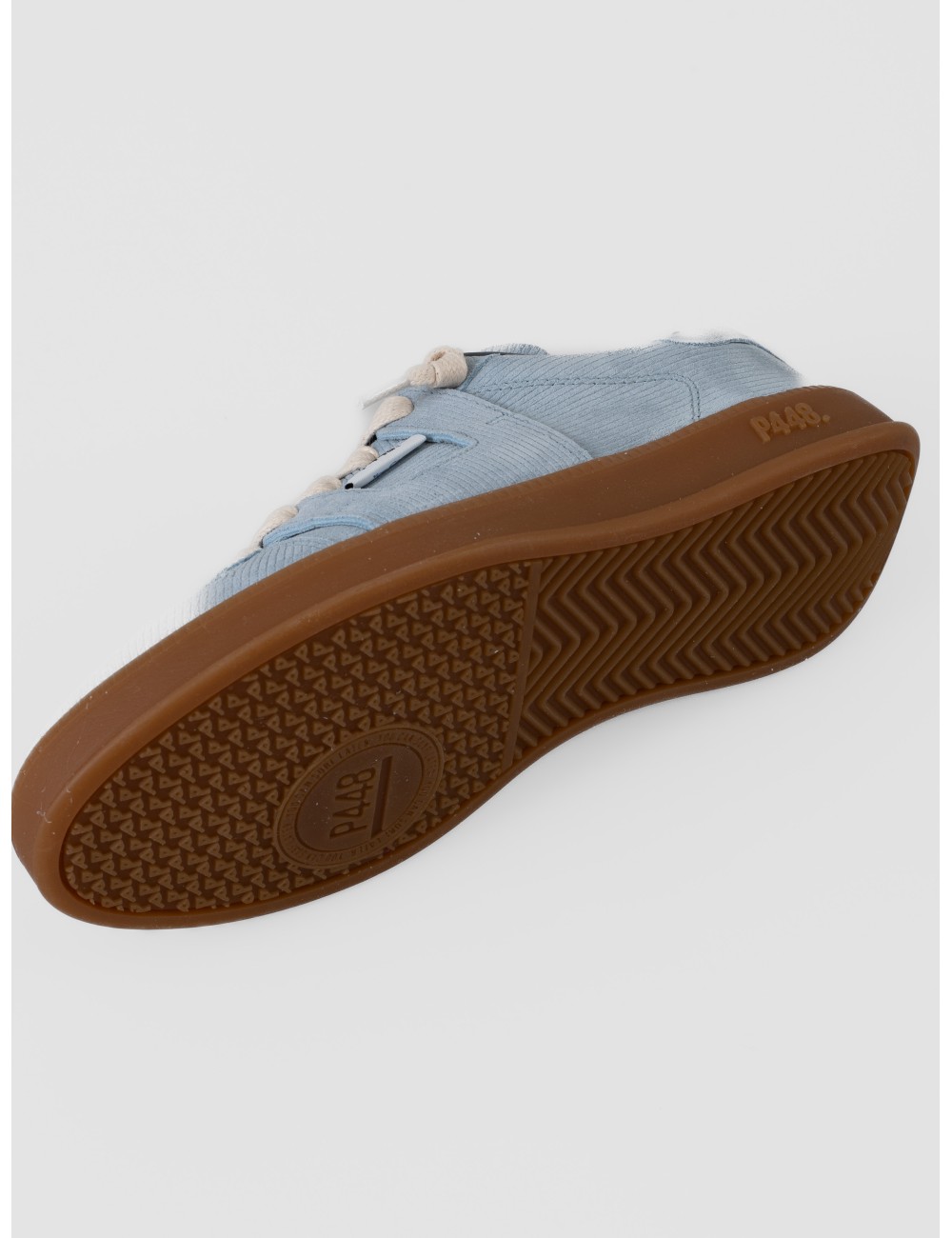 Detalles: Empeine, lengüeta, puntera y talón en ante azul claro, forro de rizo, plantilla memory foam, cordones crema, cordón extra gris oscuro, etiqueta lateral P448 y suela de goma color caramelo.