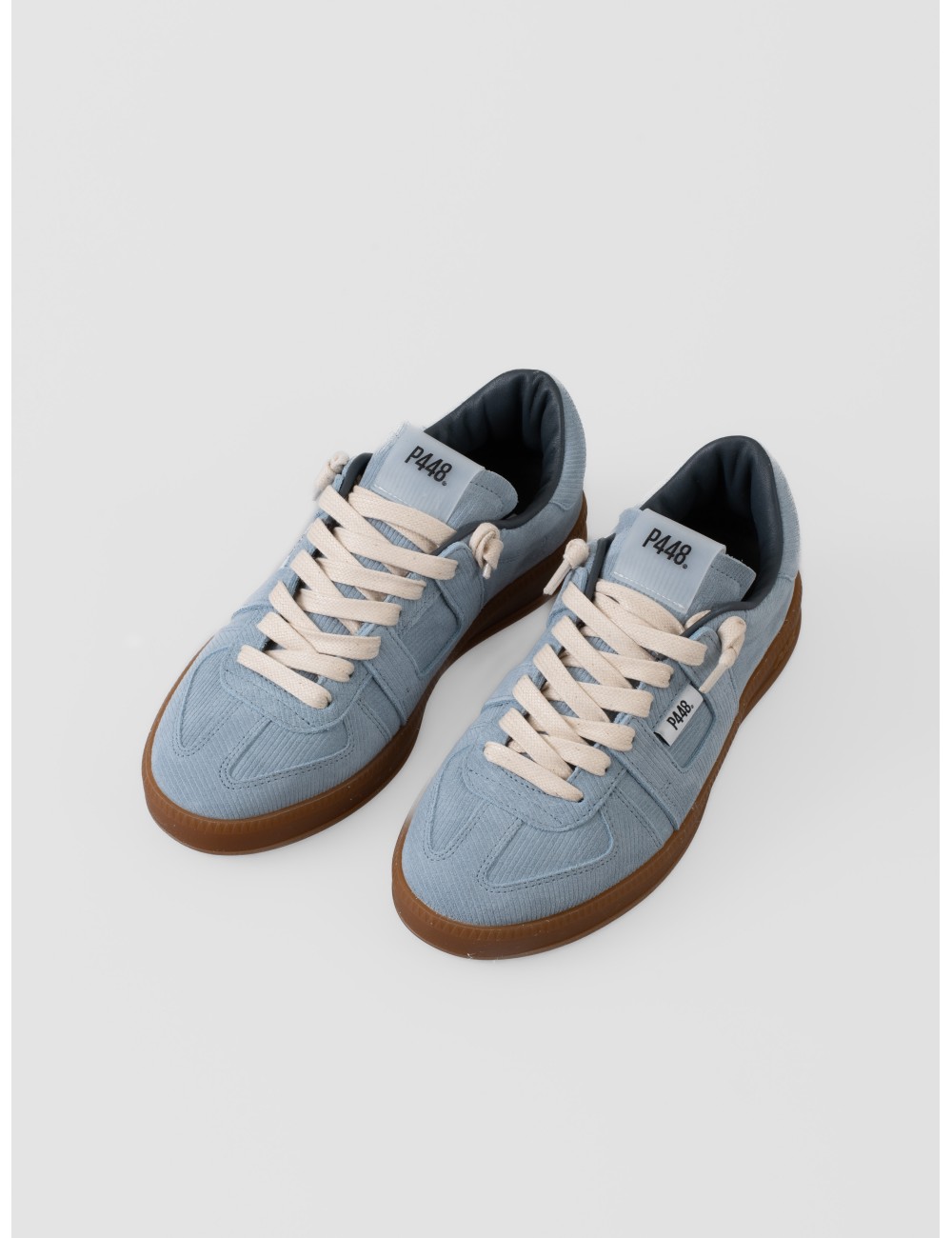 La Monza Mille de P448 interpreta la sneaker retro desde una línea más baja, ligera y afinada. El ante azul claro con textura efecto corduroy cubre toda la superficie y da al modelo una presencia uniforme, suave y muy visual, alejada de la zapatilla blanca convencional. Los cordones crema introducen un contraste limpio, mientras la suela de goma color caramelo aporta profundidad y refuerza la lectura deportiva del conjunto. La imagen coincide con estos elementos: cuerpo azul claro, interior oscuro, cordones claros y base gum.