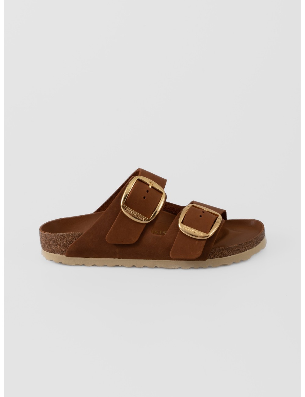 Sandalia BIRKENSTOCK Arizona Big Buckle para mujer en piel engrasada color cognac. El diseño de dos tiras combina grandes hebillas doradas con la plantilla semi-exquisite y la base anatómica de corcho y látex, manteniendo la línea limpia y reconocible del modelo.