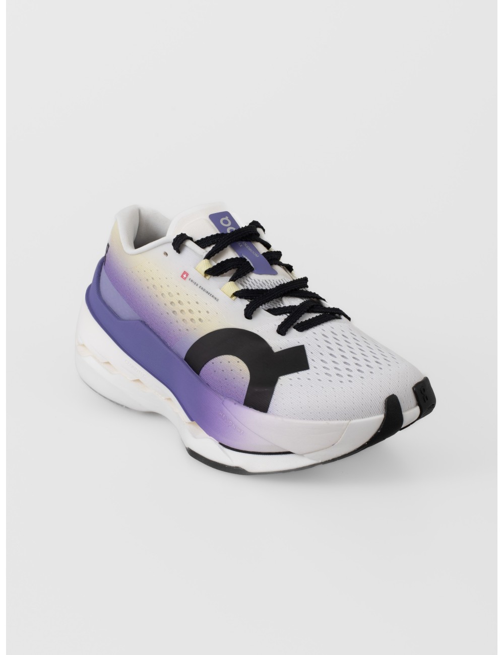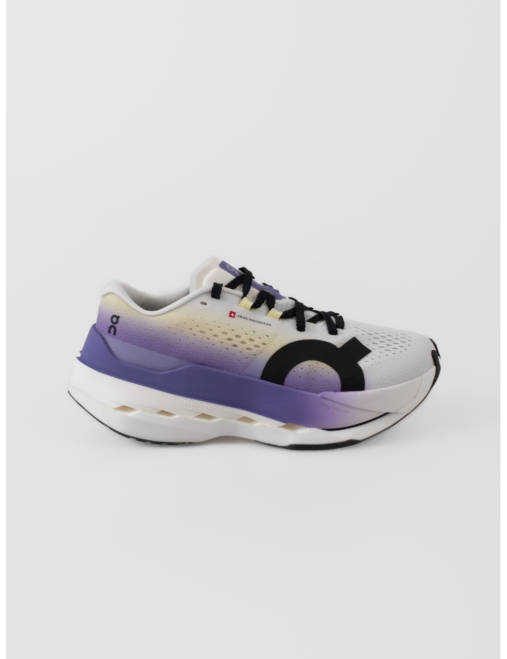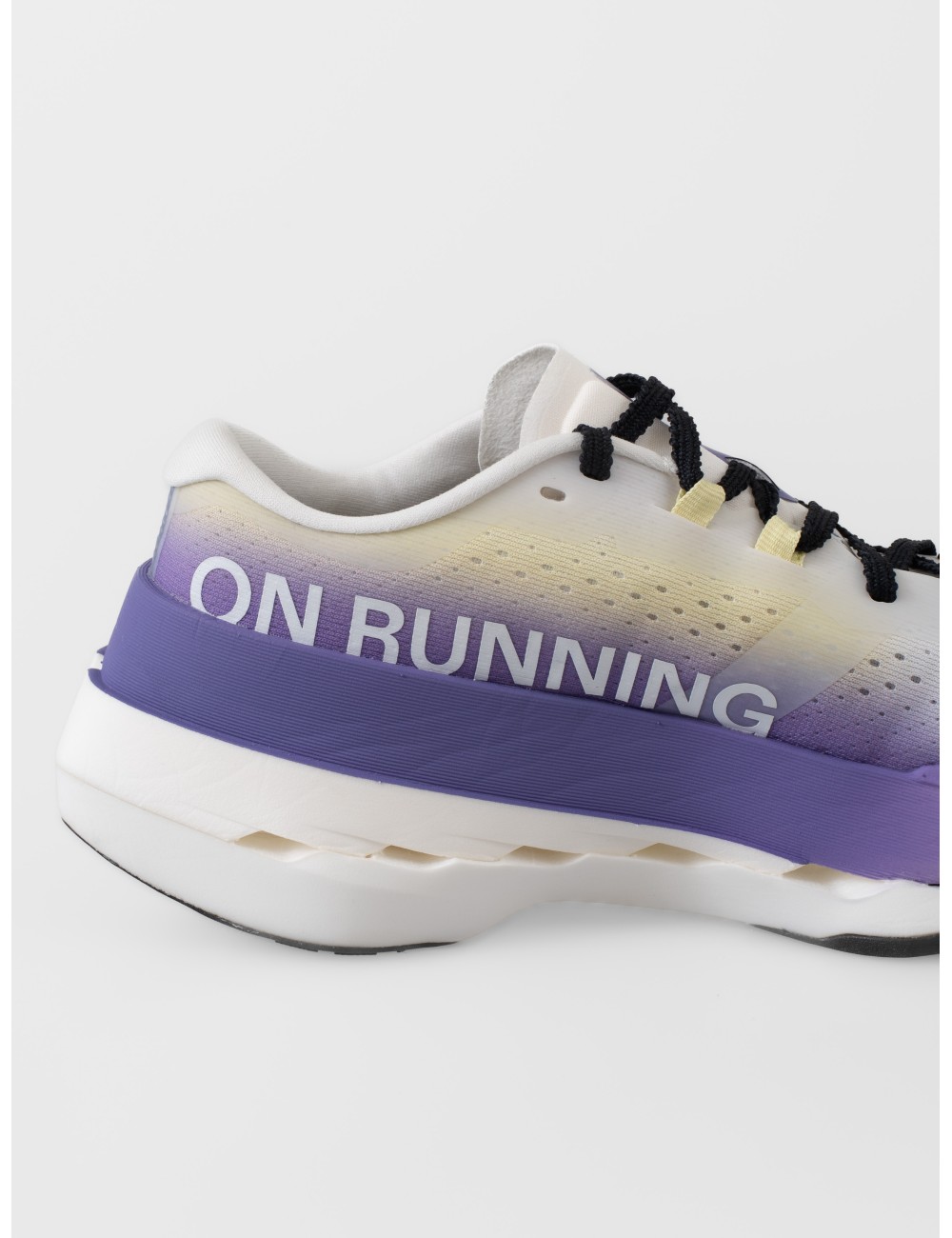 La Cloudboom Max traslada el lenguaje del rendimiento a una silueta femenina con una presencia limpia y muy definida. En esta versión White/Juniper, la base blanca se transforma con un degradado violeta en la zona trasera y en la mediasuela, un recurso que aporta profundidad visual sin alterar la claridad del conjunto. La imagen confirma ese contraste entre el mesh perforado del empeine, el gran motivo lateral negro y la estructura voluminosa de la base.