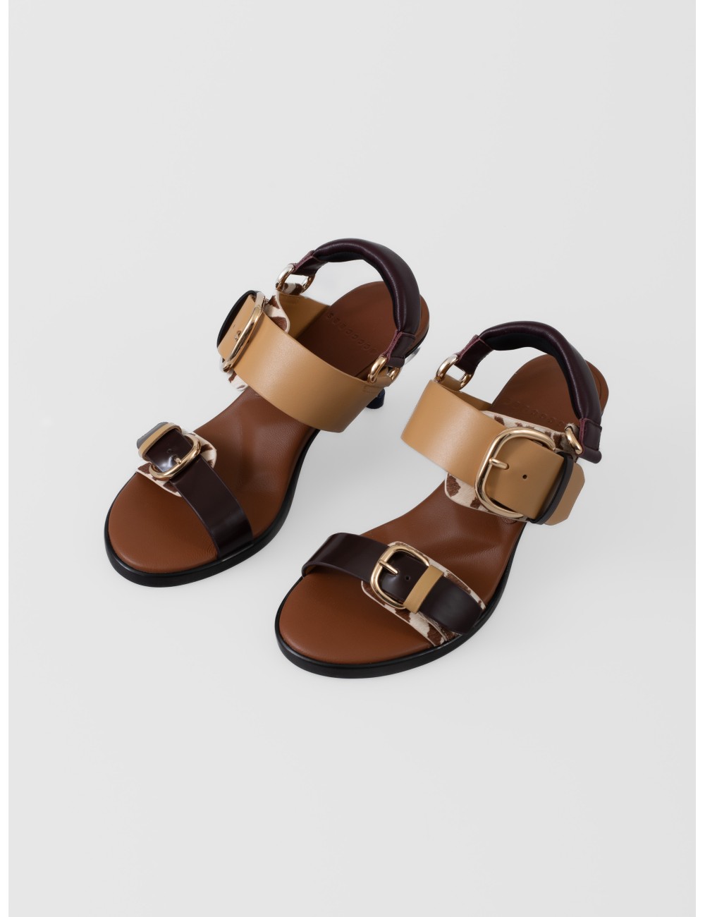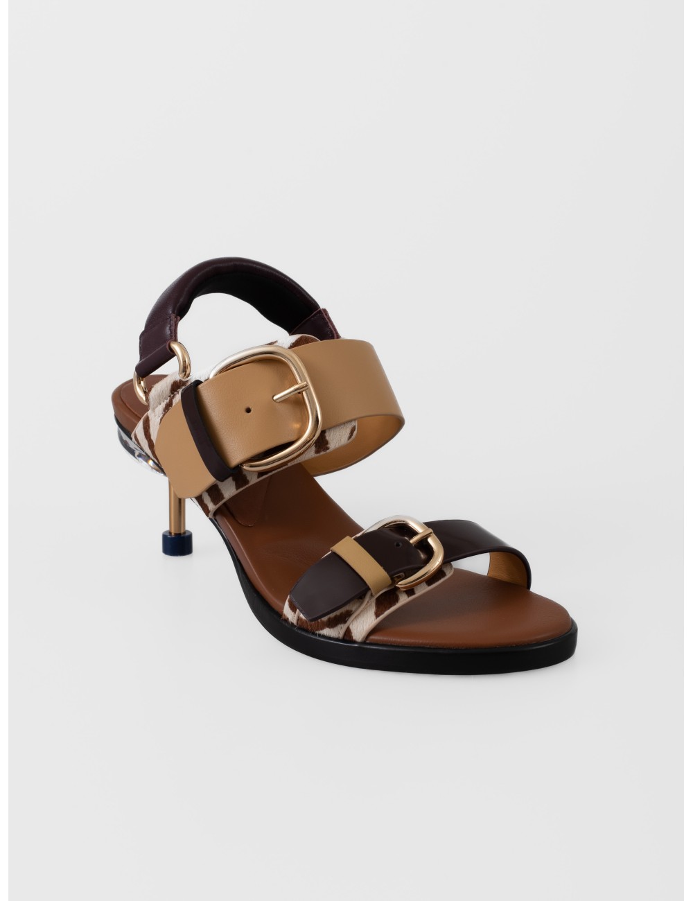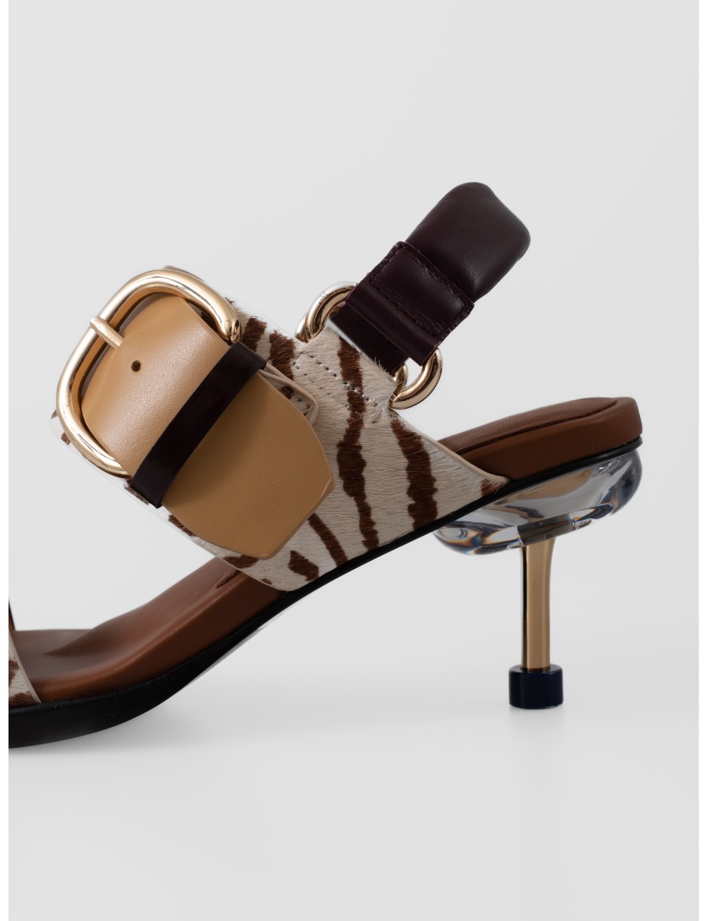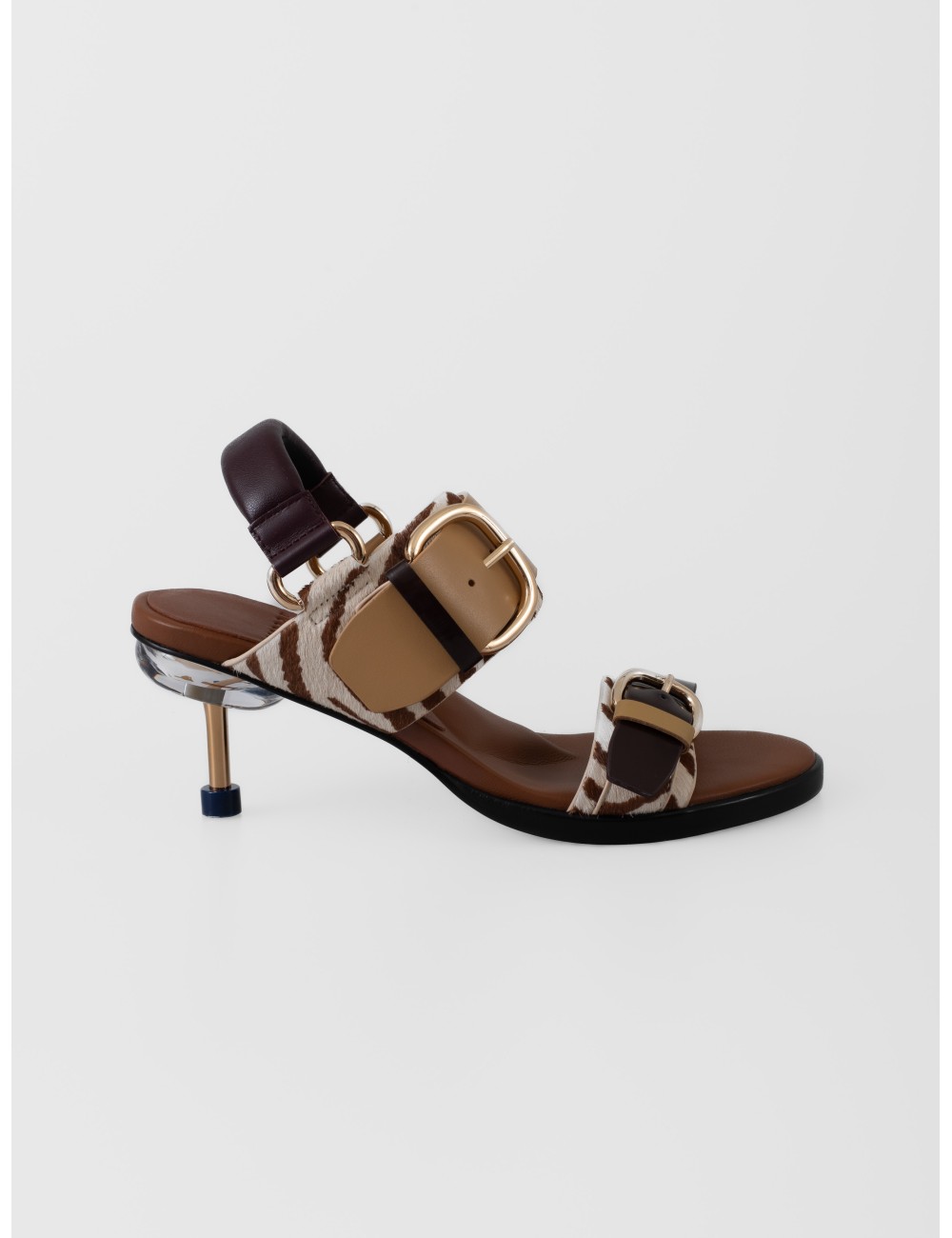 Sandalia de tacón 4CCCCEES OSHA LINE MID Zebra Mix en piel marrón y beige con estampado cebra y hebillas metálicas. Su diseño combina una silueta depurada con contraste de materiales y un tacón de 70 mm, equilibrando presencia gráfica, sujeción y comodidad para un uso versátil del día a la noche.