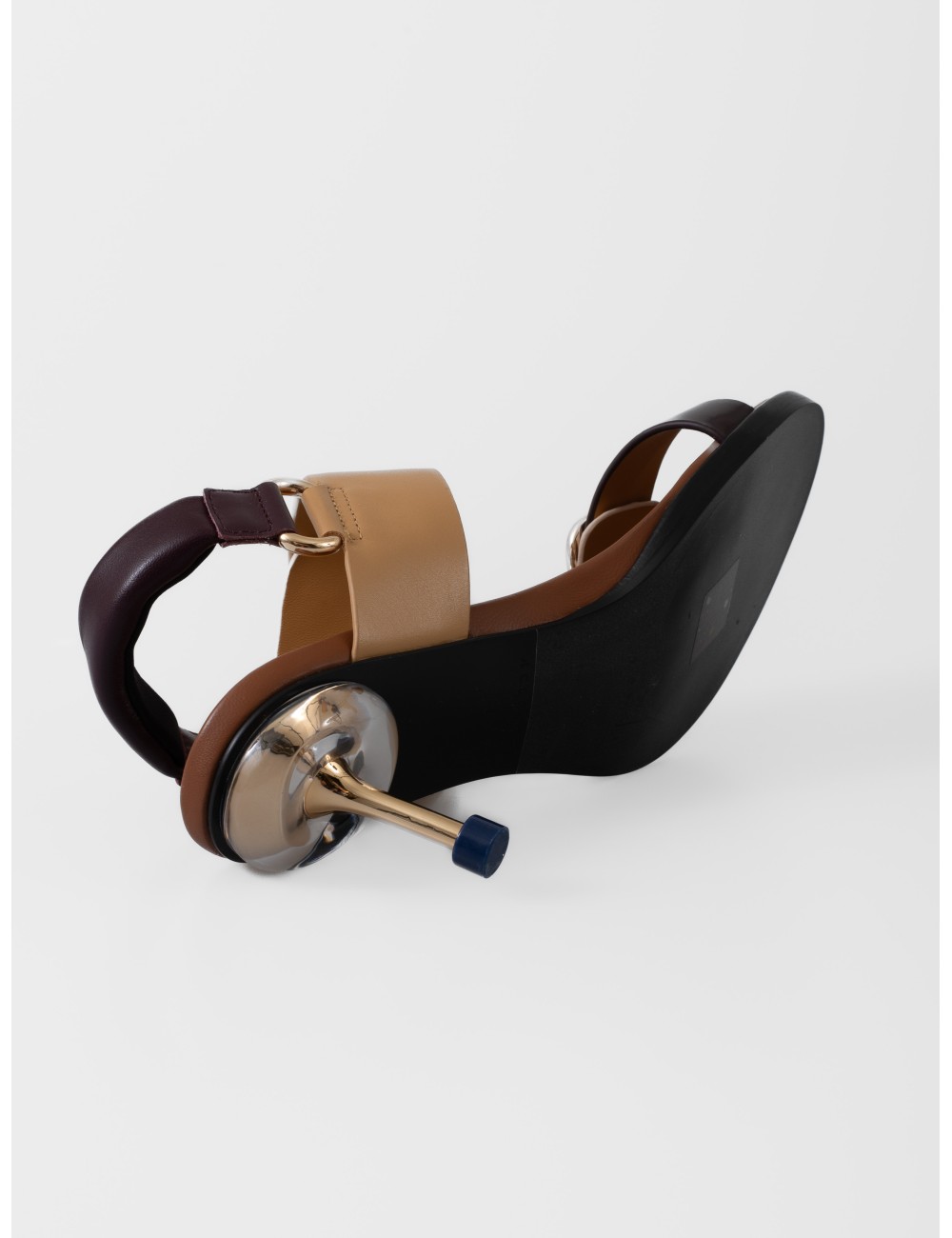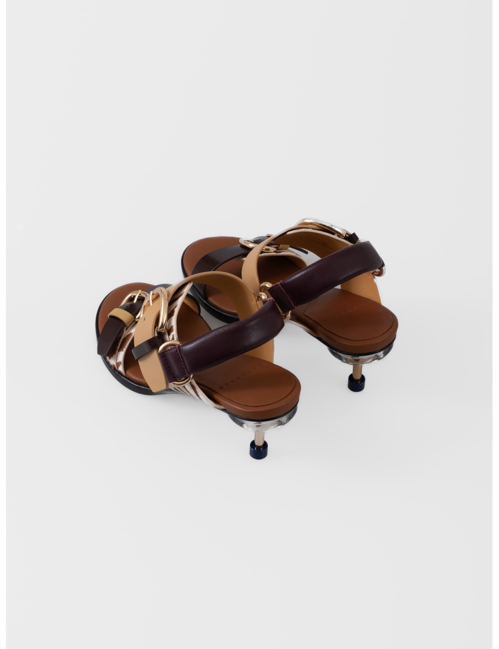 Las dos tiras ajustables con hebillas metálicas estructuran el empeine con firmeza y aportan un lenguaje casi gráfico, mientras la línea abierta de la sandalia mantiene ligereza y claridad. El tacón de 70 mm estiliza sin desplazar la comodidad a un segundo plano, algo que la marca trabaja mediante acolchado integrado y una construcción pensada para acompañar el movimiento con mayor estabilidad. La pieza trasera translúcida introduce además un matiz escultórico que refuerza la identidad del modelo.