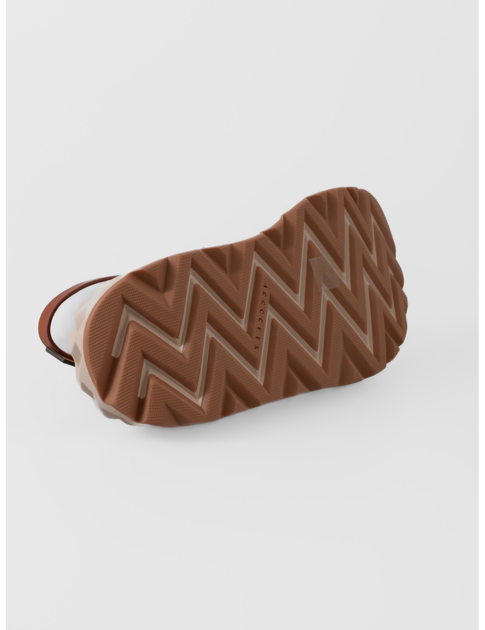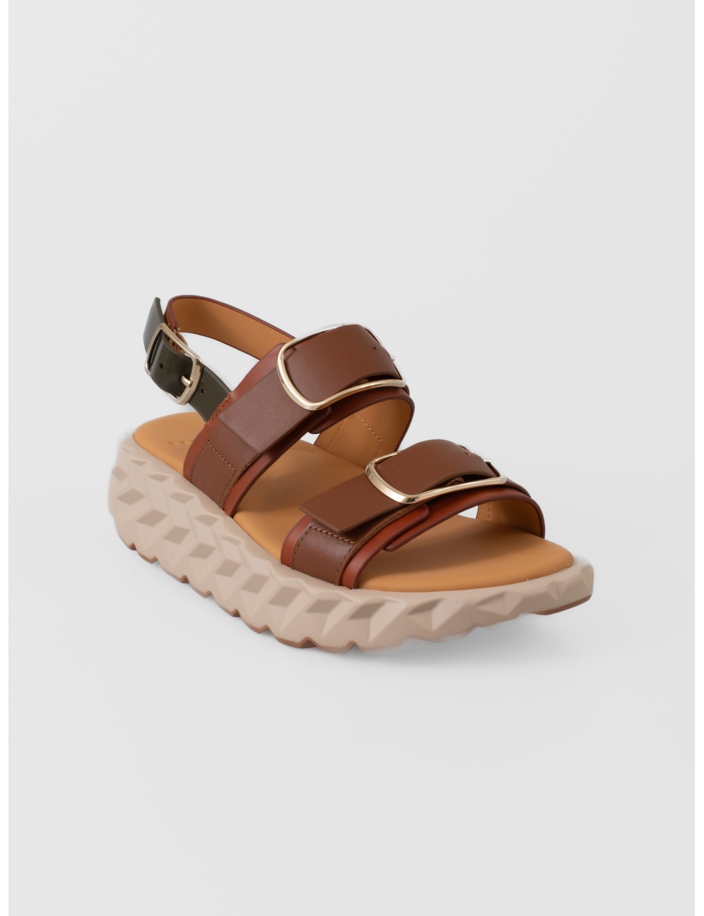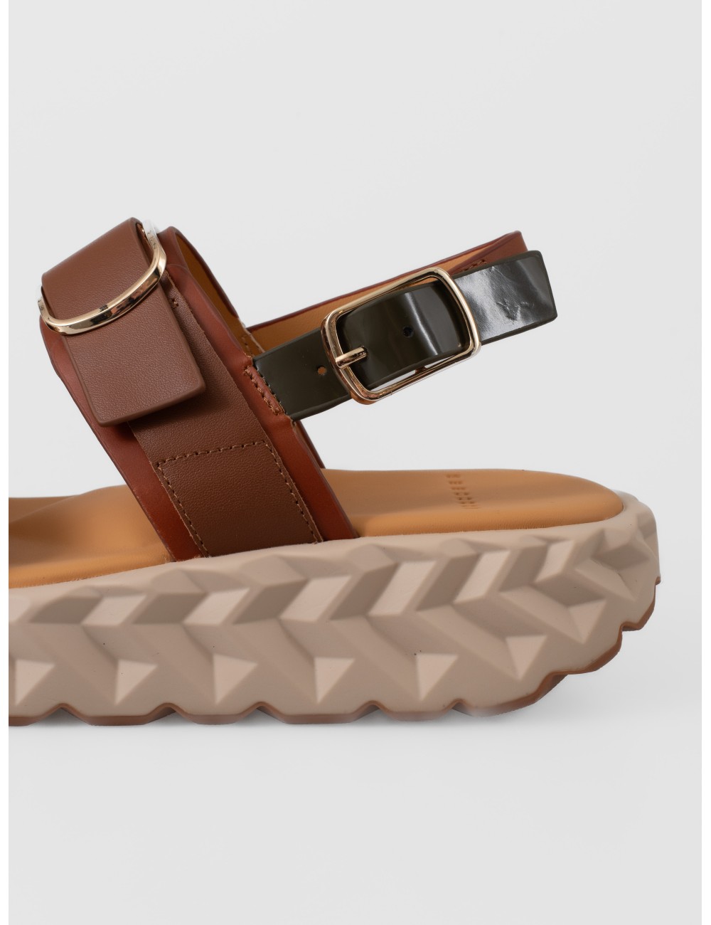 La parte superior en piel marrón mantiene el conjunto en equilibrio. Las dos tiras anchas con hebillas metálicas estructuran el empeine con firmeza y aportan un contraste sobrio frente al carácter más expresivo de la plataforma. El cierre al tobillo ayuda a ajustar la sujeción, mientras la plantilla de piel refuerza la sensación de confort en un uso prolongado. En imagen, el tono marrón cálido y la suela en beige claro acentúan esa mezcla de solidez y ligereza que define al modelo.